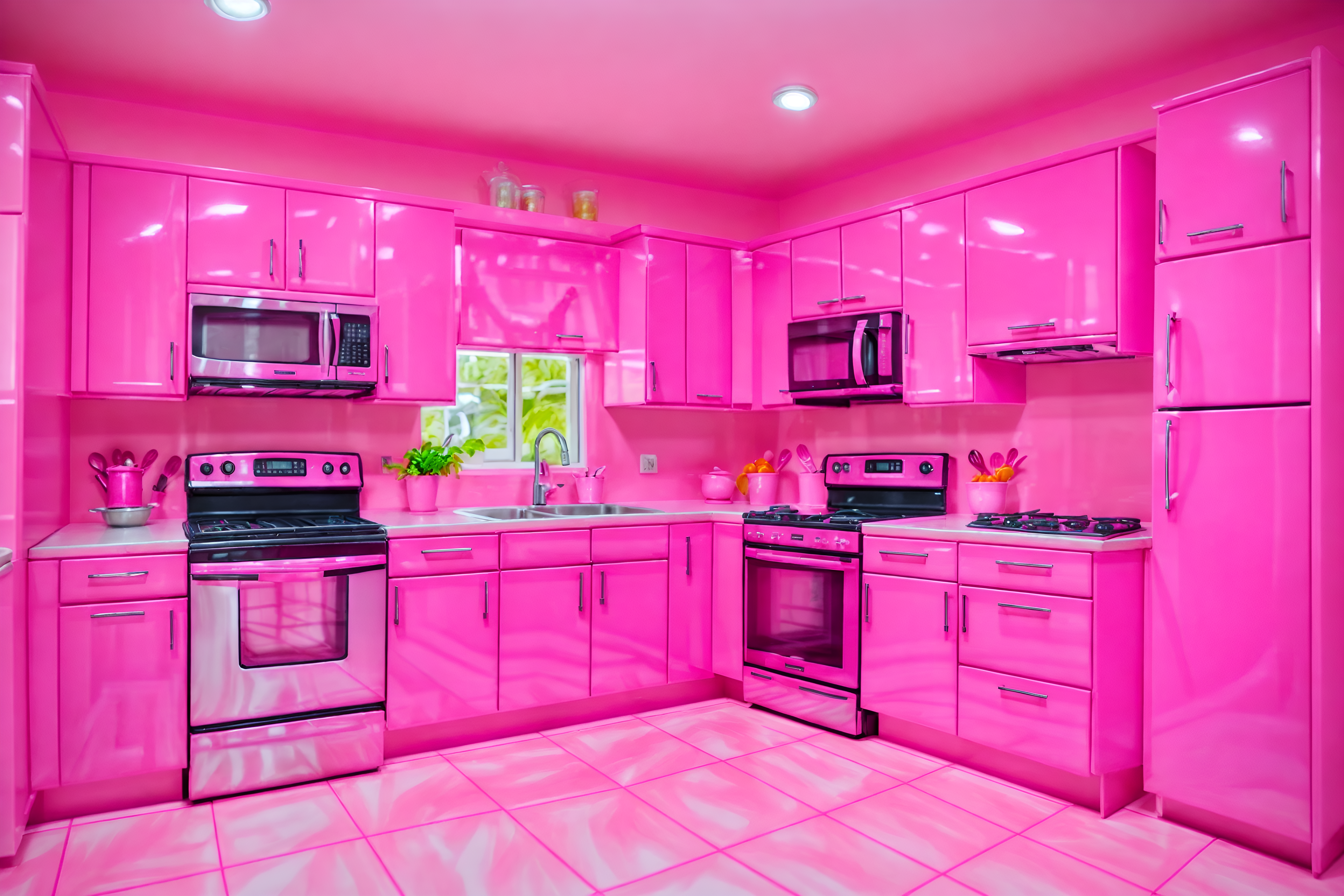 photo from pinterest of hot pink-style interior designed (kitchen interior) with kitchen cabinets and refrigerator and stove and sink and worktops and plant and kitchen cabinets. . with barbie bold rosy hues like fuchsia and magenta and hot pink barbie colors and barbie sofa and barbie plastic interior and hot pink barbie walls and barbie glitter and sparkle and barbie style interior and barbie chairs. . cinematic photo, highly detailed, cinematic lighting, ultra-detailed, ultrarealistic, photorealism, 8k. trending on pinterest. hot pink interior design style. masterpiece, cinematic light, ultrarealistic+, photorealistic+, 8k, raw photo, realistic, sharp focus on eyes, (symmetrical eyes), (intact eyes), hyperrealistic, highest quality, best quality, , highly detailed, masterpiece, best quality, extremely detailed 8k wallpaper, masterpiece, best quality, ultra-detailed, best shadow, detailed background, detailed face, detailed eyes, high contrast, best illumination, detailed face, dulux, caustic, dynamic angle, detailed glow. dramatic lighting. highly detailed, insanely detailed hair, symmetrical, intricate details, professionally retouched, 8k high definition. strong bokeh. award winning photo.