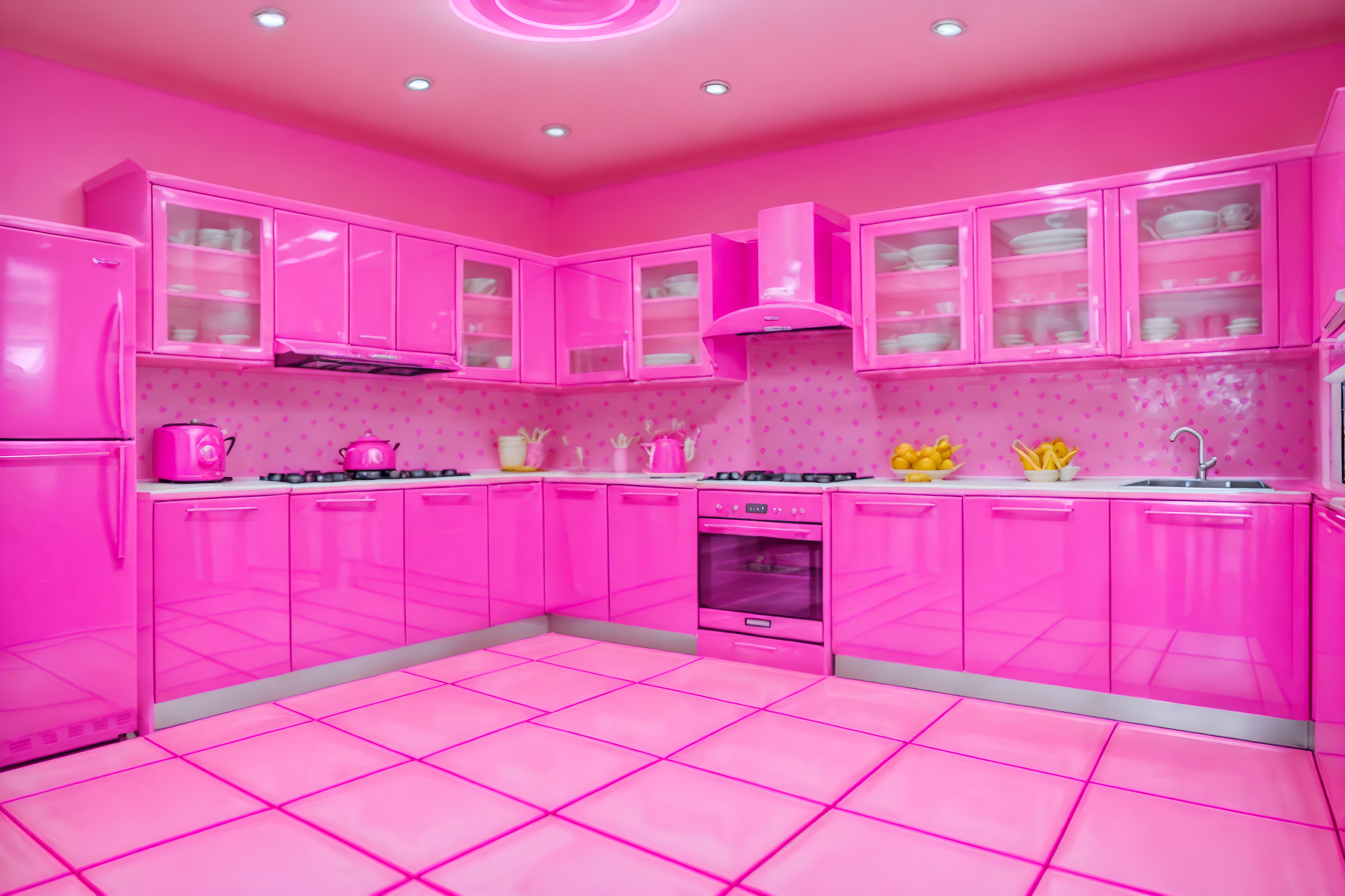 photo from pinterest of hot pink-style interior designed (kitchen interior) with kitchen cabinets and refrigerator and stove and sink and worktops and plant and kitchen cabinets. . with barbie bold rosy hues like fuchsia and magenta and hot pink barbie colors and barbie sofa and barbie plastic interior and hot pink barbie walls and barbie glitter and sparkle and barbie style interior and barbie chairs. . cinematic photo, highly detailed, cinematic lighting, ultra-detailed, ultrarealistic, photorealism, 8k. trending on pinterest. hot pink interior design style. masterpiece, cinematic light, ultrarealistic+, photorealistic+, 8k, raw photo, realistic, sharp focus on eyes, (symmetrical eyes), (intact eyes), hyperrealistic, highest quality, best quality, , highly detailed, masterpiece, best quality, extremely detailed 8k wallpaper, masterpiece, best quality, ultra-detailed, best shadow, detailed background, detailed face, detailed eyes, high contrast, best illumination, detailed face, dulux, caustic, dynamic angle, detailed glow. dramatic lighting. highly detailed, insanely detailed hair, symmetrical, intricate details, professionally retouched, 8k high definition. strong bokeh. award winning photo.