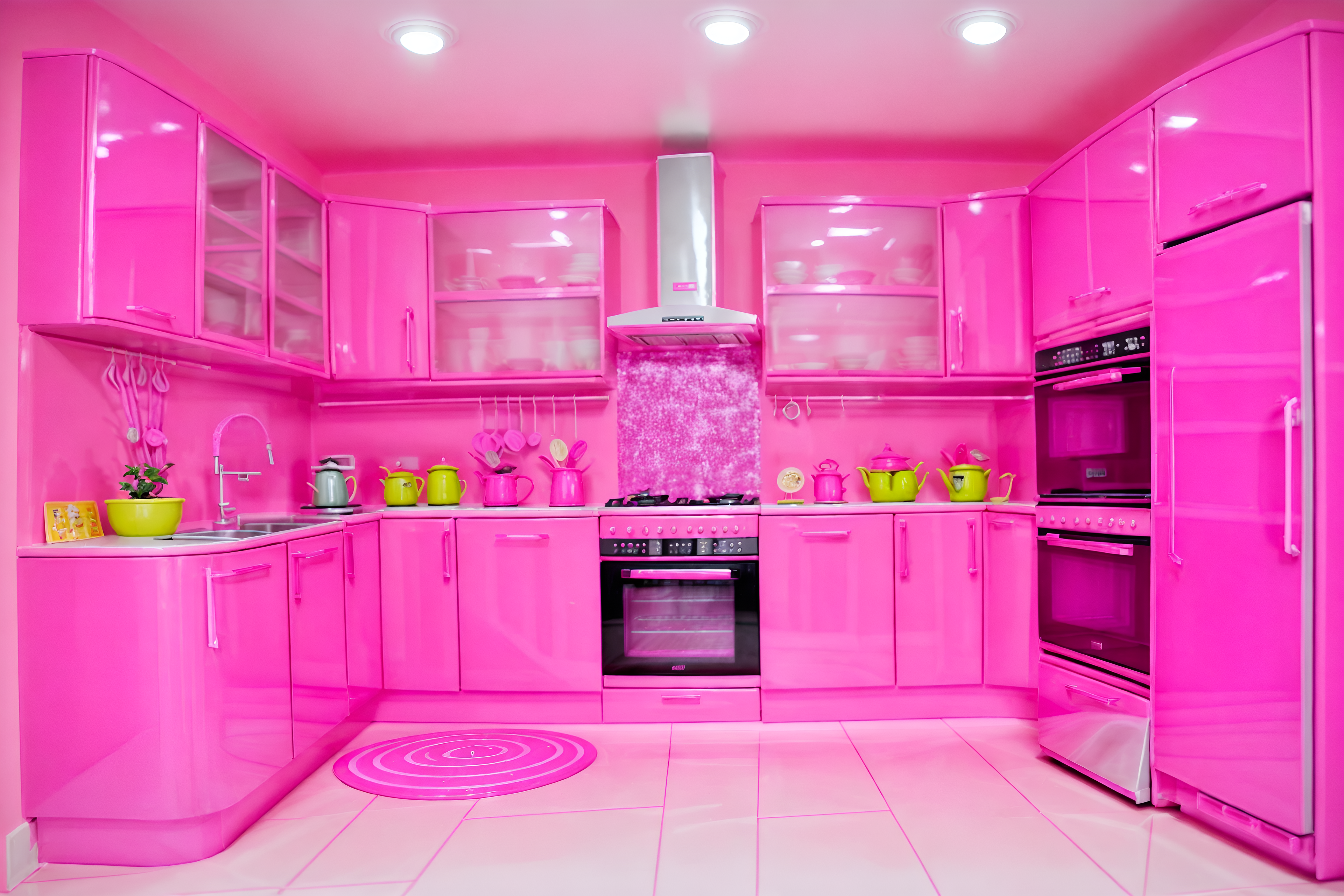 photo from pinterest of hot pink-style interior designed (kitchen interior) with kitchen cabinets and refrigerator and stove and sink and worktops and plant and kitchen cabinets. . with barbie bold rosy hues like fuchsia and magenta and hot pink barbie colors and barbie sofa and barbie plastic interior and hot pink barbie walls and barbie glitter and sparkle and barbie style interior and barbie chairs. . cinematic photo, highly detailed, cinematic lighting, ultra-detailed, ultrarealistic, photorealism, 8k. trending on pinterest. hot pink interior design style. masterpiece, cinematic light, ultrarealistic+, photorealistic+, 8k, raw photo, realistic, sharp focus on eyes, (symmetrical eyes), (intact eyes), hyperrealistic, highest quality, best quality, , highly detailed, masterpiece, best quality, extremely detailed 8k wallpaper, masterpiece, best quality, ultra-detailed, best shadow, detailed background, detailed face, detailed eyes, high contrast, best illumination, detailed face, dulux, caustic, dynamic angle, detailed glow. dramatic lighting. highly detailed, insanely detailed hair, symmetrical, intricate details, professionally retouched, 8k high definition. strong bokeh. award winning photo.