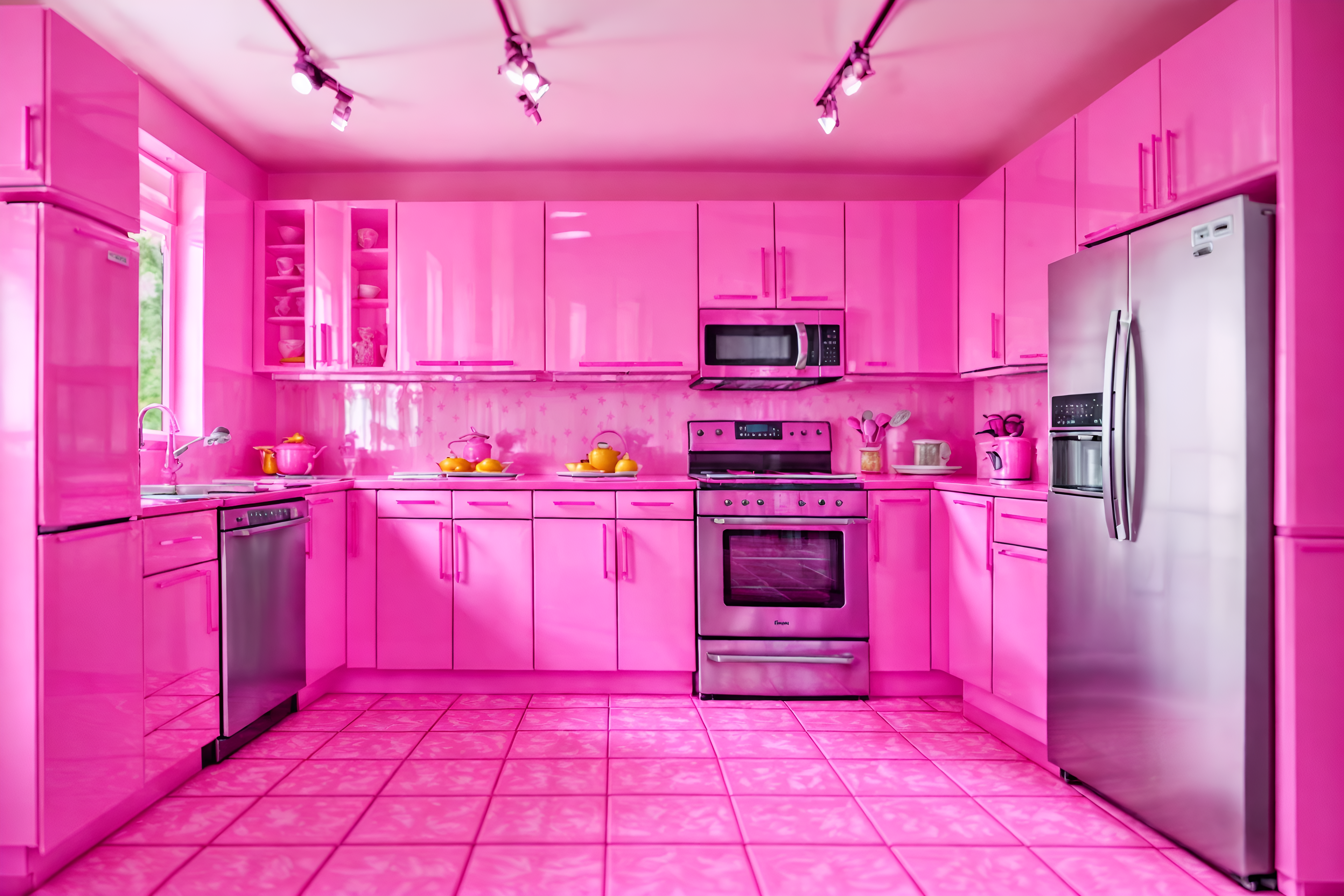 photo from pinterest of hot pink-style interior designed (kitchen interior) with kitchen cabinets and refrigerator and stove and sink and worktops and plant and kitchen cabinets. . with barbie bold rosy hues like fuchsia and magenta and hot pink barbie colors and barbie sofa and barbie plastic interior and hot pink barbie walls and barbie glitter and sparkle and barbie style interior and barbie chairs. . cinematic photo, highly detailed, cinematic lighting, ultra-detailed, ultrarealistic, photorealism, 8k. trending on pinterest. hot pink interior design style. masterpiece, cinematic light, ultrarealistic+, photorealistic+, 8k, raw photo, realistic, sharp focus on eyes, (symmetrical eyes), (intact eyes), hyperrealistic, highest quality, best quality, , highly detailed, masterpiece, best quality, extremely detailed 8k wallpaper, masterpiece, best quality, ultra-detailed, best shadow, detailed background, detailed face, detailed eyes, high contrast, best illumination, detailed face, dulux, caustic, dynamic angle, detailed glow. dramatic lighting. highly detailed, insanely detailed hair, symmetrical, intricate details, professionally retouched, 8k high definition. strong bokeh. award winning photo.