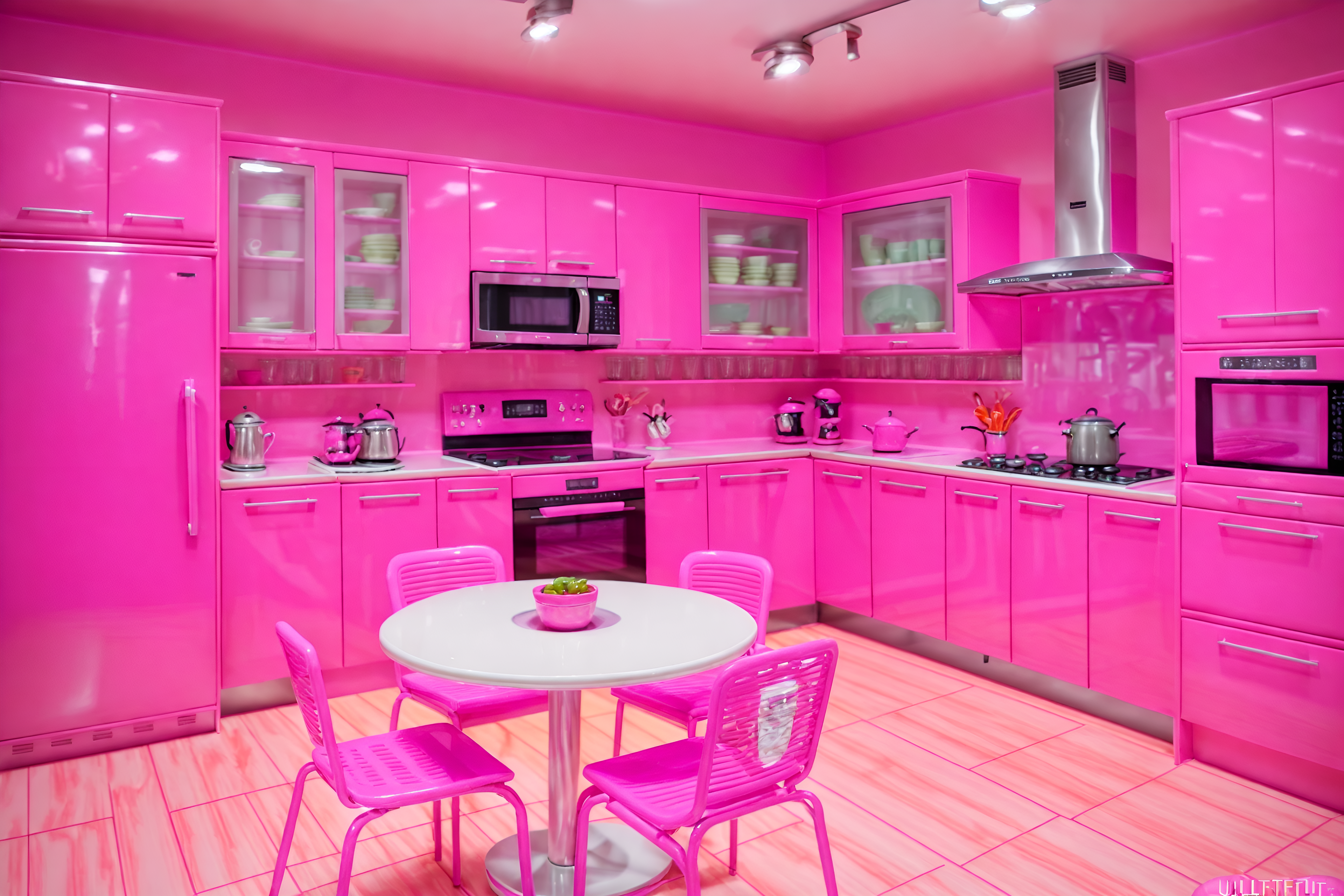 photo from pinterest of hot pink-style interior designed (kitchen interior) with kitchen cabinets and refrigerator and stove and sink and worktops and plant and kitchen cabinets. . with barbie bold rosy hues like fuchsia and magenta and hot pink barbie colors and barbie sofa and barbie plastic interior and hot pink barbie walls and barbie glitter and sparkle and barbie style interior and barbie chairs. . cinematic photo, highly detailed, cinematic lighting, ultra-detailed, ultrarealistic, photorealism, 8k. trending on pinterest. hot pink interior design style. masterpiece, cinematic light, ultrarealistic+, photorealistic+, 8k, raw photo, realistic, sharp focus on eyes, (symmetrical eyes), (intact eyes), hyperrealistic, highest quality, best quality, , highly detailed, masterpiece, best quality, extremely detailed 8k wallpaper, masterpiece, best quality, ultra-detailed, best shadow, detailed background, detailed face, detailed eyes, high contrast, best illumination, detailed face, dulux, caustic, dynamic angle, detailed glow. dramatic lighting. highly detailed, insanely detailed hair, symmetrical, intricate details, professionally retouched, 8k high definition. strong bokeh. award winning photo.