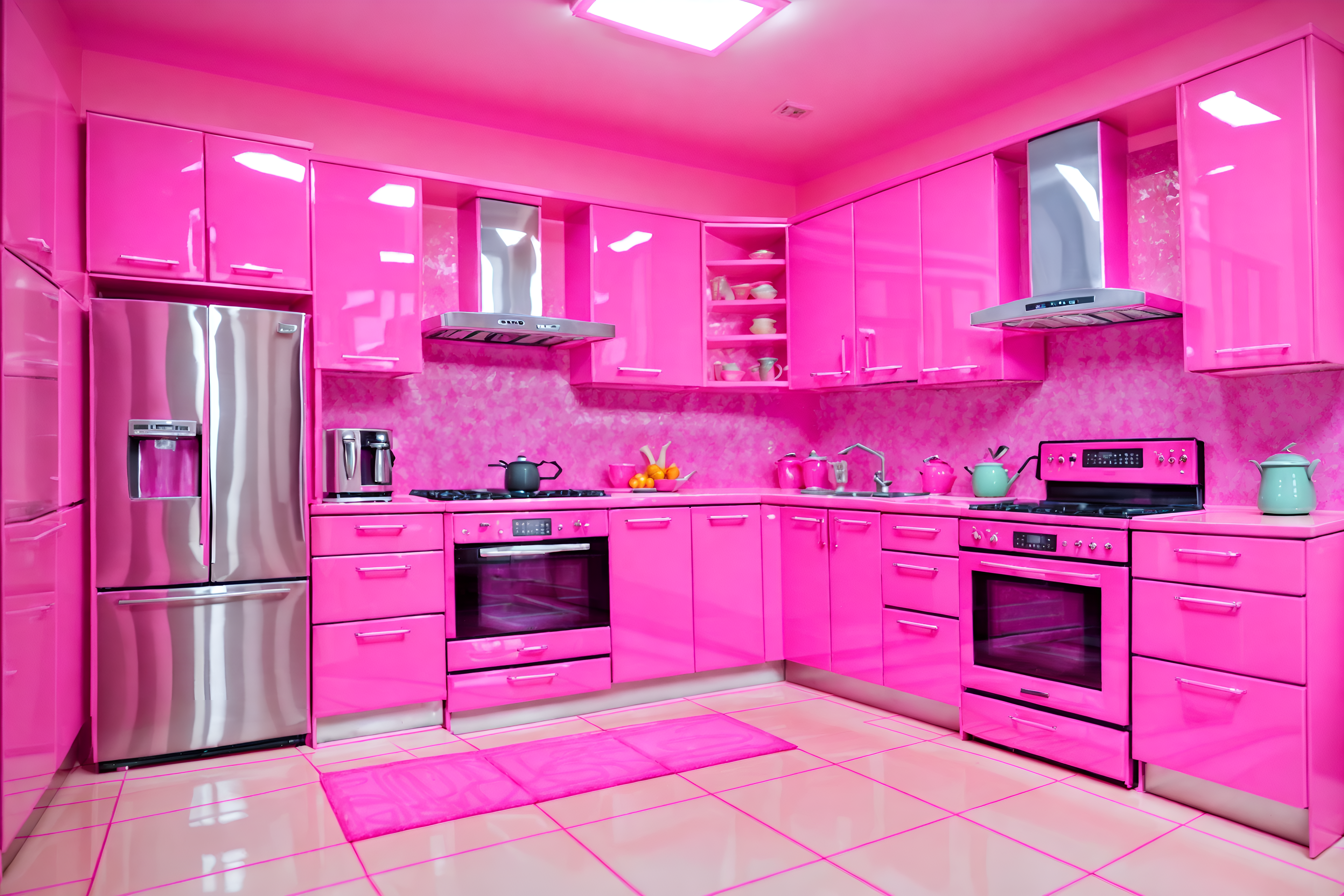 photo from pinterest of hot pink-style interior designed (kitchen interior) with kitchen cabinets and refrigerator and stove and sink and worktops and plant and kitchen cabinets. . with barbie bold rosy hues like fuchsia and magenta and hot pink barbie colors and barbie sofa and barbie plastic interior and hot pink barbie walls and barbie glitter and sparkle and barbie style interior and barbie chairs. . cinematic photo, highly detailed, cinematic lighting, ultra-detailed, ultrarealistic, photorealism, 8k. trending on pinterest. hot pink interior design style. masterpiece, cinematic light, ultrarealistic+, photorealistic+, 8k, raw photo, realistic, sharp focus on eyes, (symmetrical eyes), (intact eyes), hyperrealistic, highest quality, best quality, , highly detailed, masterpiece, best quality, extremely detailed 8k wallpaper, masterpiece, best quality, ultra-detailed, best shadow, detailed background, detailed face, detailed eyes, high contrast, best illumination, detailed face, dulux, caustic, dynamic angle, detailed glow. dramatic lighting. highly detailed, insanely detailed hair, symmetrical, intricate details, professionally retouched, 8k high definition. strong bokeh. award winning photo.