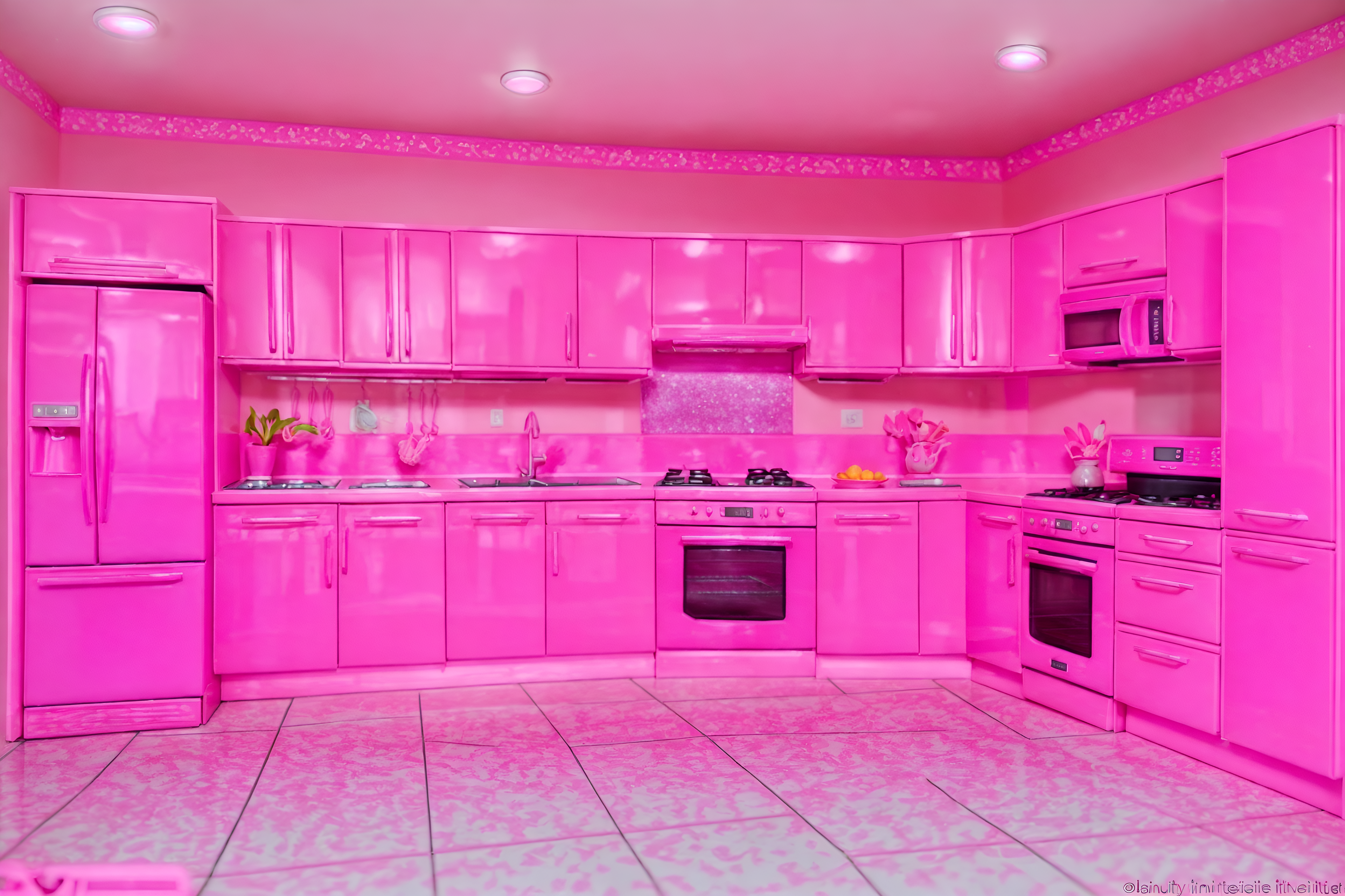 photo from pinterest of hot pink-style interior designed (kitchen interior) with kitchen cabinets and refrigerator and stove and sink and worktops and plant and kitchen cabinets. . with barbie bold rosy hues like fuchsia and magenta and hot pink barbie colors and barbie sofa and barbie plastic interior and hot pink barbie walls and barbie glitter and sparkle and barbie style interior and barbie chairs. . cinematic photo, highly detailed, cinematic lighting, ultra-detailed, ultrarealistic, photorealism, 8k. trending on pinterest. hot pink interior design style. masterpiece, cinematic light, ultrarealistic+, photorealistic+, 8k, raw photo, realistic, sharp focus on eyes, (symmetrical eyes), (intact eyes), hyperrealistic, highest quality, best quality, , highly detailed, masterpiece, best quality, extremely detailed 8k wallpaper, masterpiece, best quality, ultra-detailed, best shadow, detailed background, detailed face, detailed eyes, high contrast, best illumination, detailed face, dulux, caustic, dynamic angle, detailed glow. dramatic lighting. highly detailed, insanely detailed hair, symmetrical, intricate details, professionally retouched, 8k high definition. strong bokeh. award winning photo.