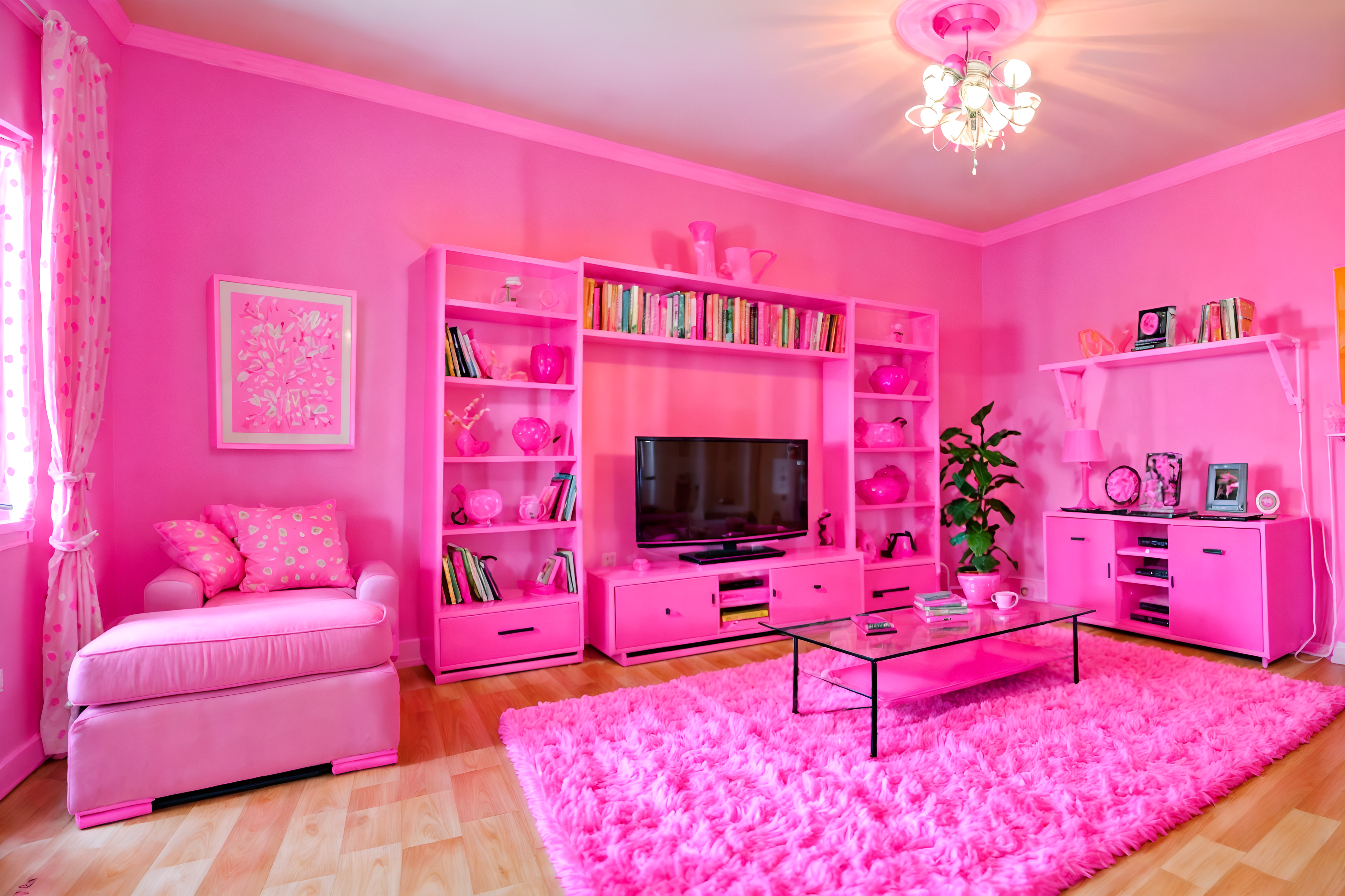 Photo from Pinterest of Hot pink-style interior designed (living room interior) With televisions and furniture and chairs and coffee tables and plant and bookshelves and electric lamps and rug. . With Barbie sofa and Barbie style interior and hot pink Barbie colors and hot pink Barbie walls and Barbie chairs and Barbie bold rosy hues like fuchsia and magenta and Barbie closet and Barbie plastic interior. . Cinematic photo, highly detailed, cinematic lighting, ultra-detailed, ultrarealistic, photorealism, 8k. Trending on Pinterest. Hot pink interior design style