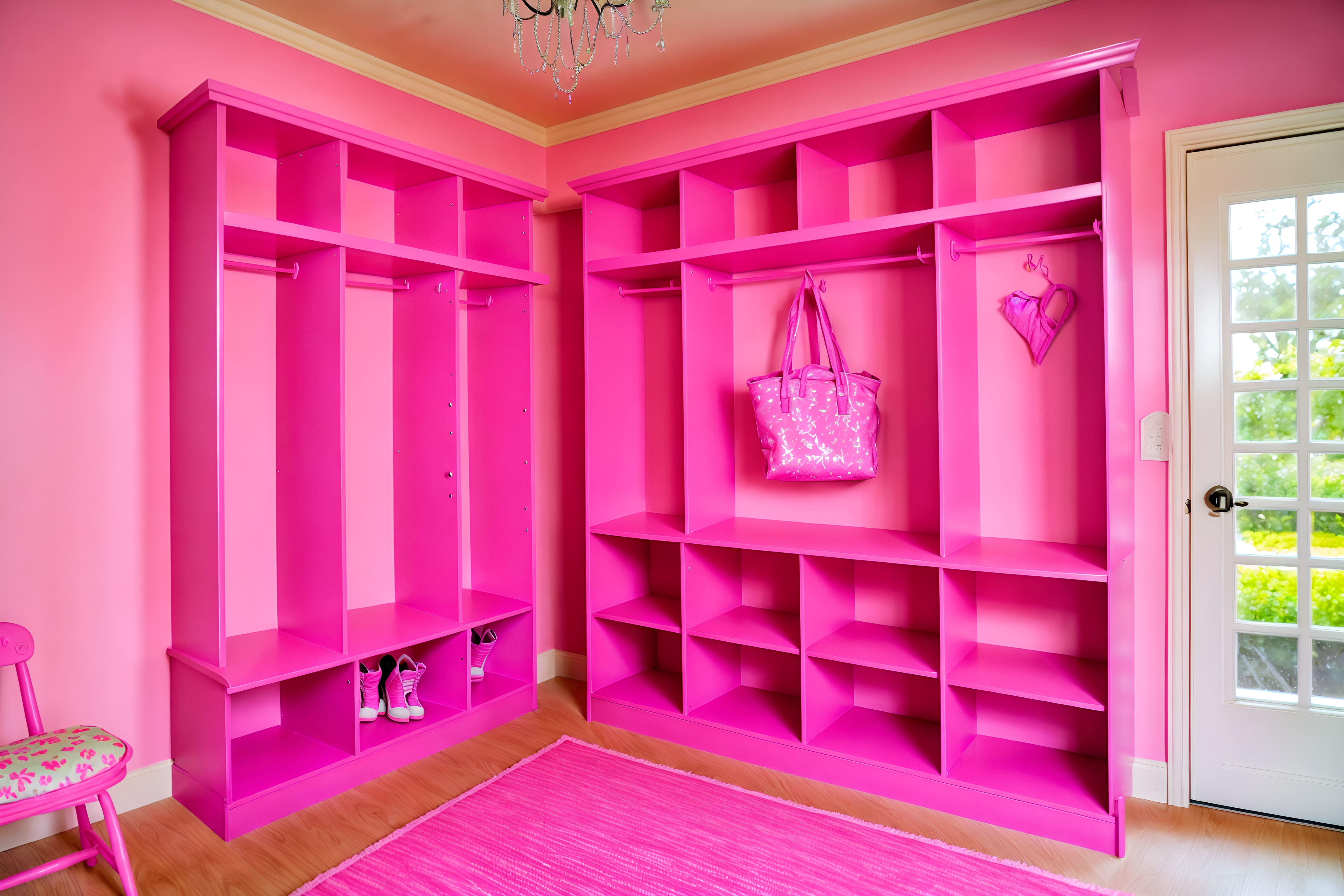 hot pink mudroomsinterior decorate this mudroom with hot pink style. . . with shelves for shoes and cubbies and storage baskets and wall hooks for coats and a bench and high up storage and cabinets and storage drawers. . with barbie glitter and sparkle and barbie plastic interior and barbie bold rosy hues like fuchsia and magenta and hot pink barbie colors and hot pink barbie walls and barbie sofa and barbie chairs and barbie closet. . .