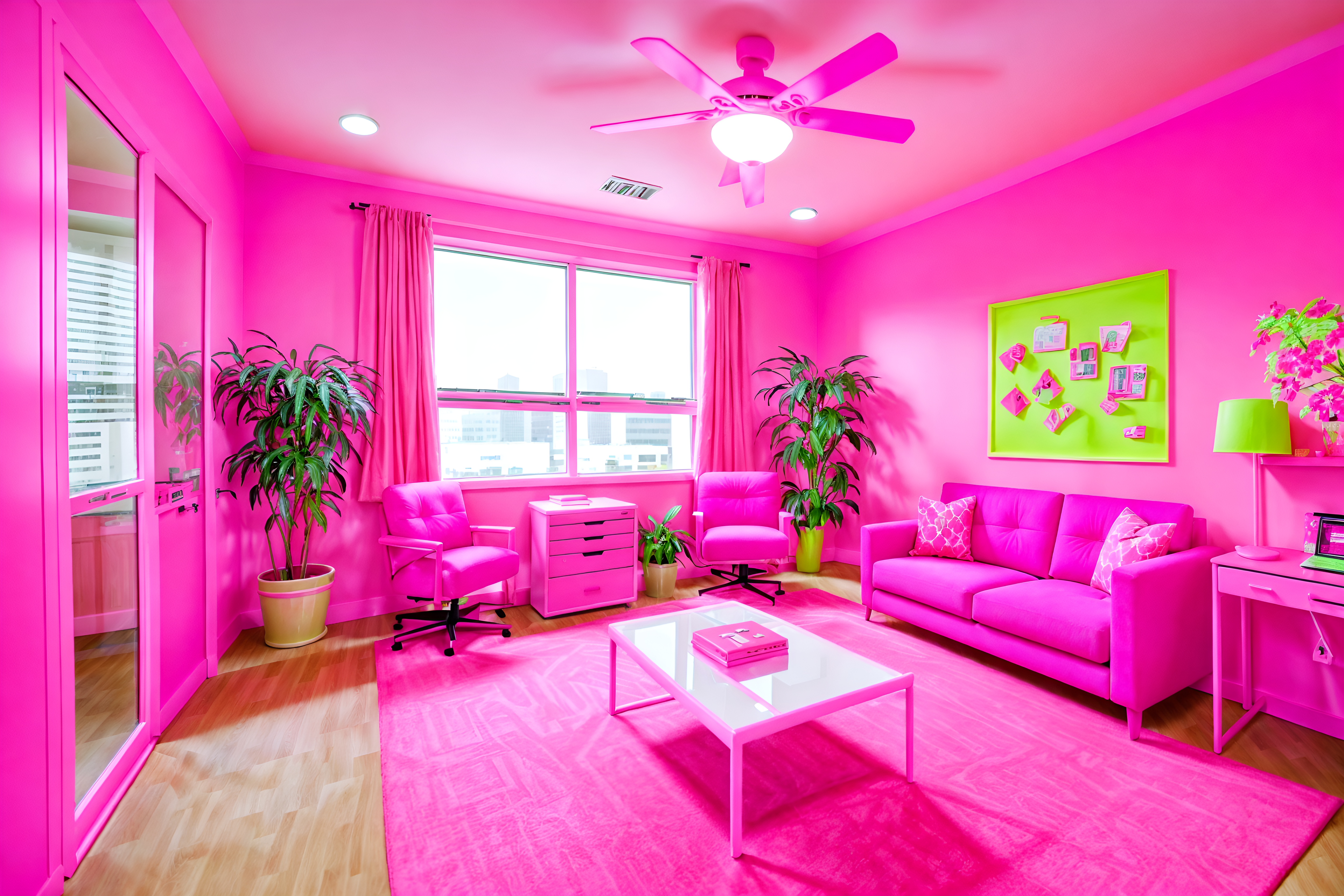 photo from pinterest of hot pink-style interior designed (office interior) with cabinets and computer desks and seating area with sofa and office desks and windows and lounge chairs and office chairs and plants. . with barbie style interior and barbie closet and barbie sofa and barbie chairs and hot pink barbie walls and hot pink barbie colors and barbie plastic interior and barbie bold rosy hues like fuchsia and magenta. . cinematic photo, highly detailed, cinematic lighting, ultra-detailed, ultrarealistic, photorealism, 8k. trending on pinterest. hot pink interior design style. masterpiece, cinematic light, ultrarealistic+, photorealistic+, 8k, raw photo, realistic, sharp focus on eyes, (symmetrical eyes), (intact eyes), hyperrealistic, highest quality, best quality, , highly detailed, masterpiece, best quality, extremely detailed 8k wallpaper, masterpiece, best quality, ultra-detailed, best shadow, detailed background, detailed face, detailed eyes, high contrast, best illumination, detailed face, dulux, caustic, dynamic angle, detailed glow. dramatic lighting. highly detailed, insanely detailed hair, symmetrical, intricate details, professionally retouched, 8k high definition. strong bokeh. award winning photo.