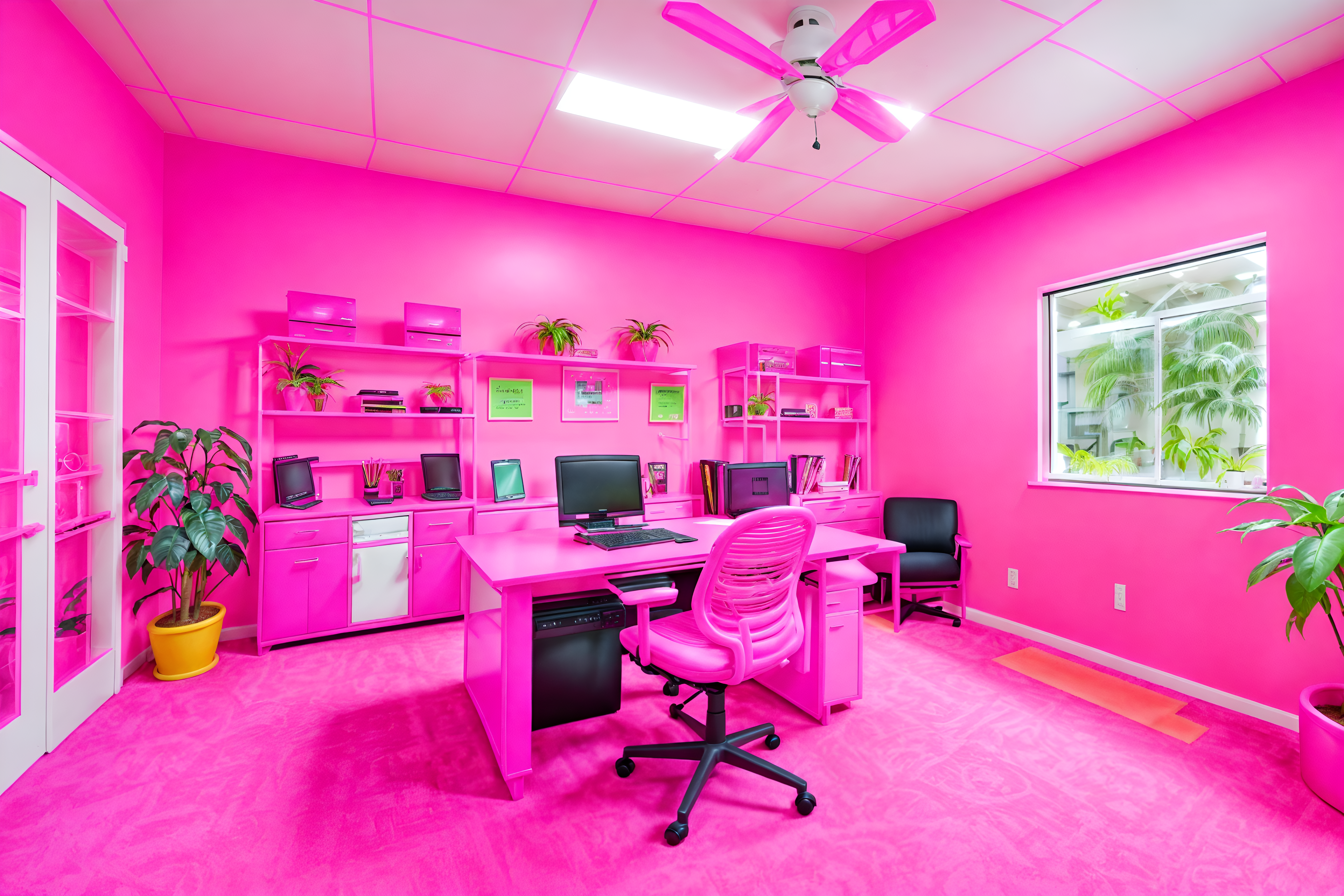 photo from pinterest of hot pink-style interior designed (office interior) with cabinets and computer desks and seating area with sofa and office desks and windows and lounge chairs and office chairs and plants. . with barbie style interior and barbie closet and barbie sofa and barbie chairs and hot pink barbie walls and hot pink barbie colors and barbie plastic interior and barbie bold rosy hues like fuchsia and magenta. . cinematic photo, highly detailed, cinematic lighting, ultra-detailed, ultrarealistic, photorealism, 8k. trending on pinterest. hot pink interior design style. masterpiece, cinematic light, ultrarealistic+, photorealistic+, 8k, raw photo, realistic, sharp focus on eyes, (symmetrical eyes), (intact eyes), hyperrealistic, highest quality, best quality, , highly detailed, masterpiece, best quality, extremely detailed 8k wallpaper, masterpiece, best quality, ultra-detailed, best shadow, detailed background, detailed face, detailed eyes, high contrast, best illumination, detailed face, dulux, caustic, dynamic angle, detailed glow. dramatic lighting. highly detailed, insanely detailed hair, symmetrical, intricate details, professionally retouched, 8k high definition. strong bokeh. award winning photo.
