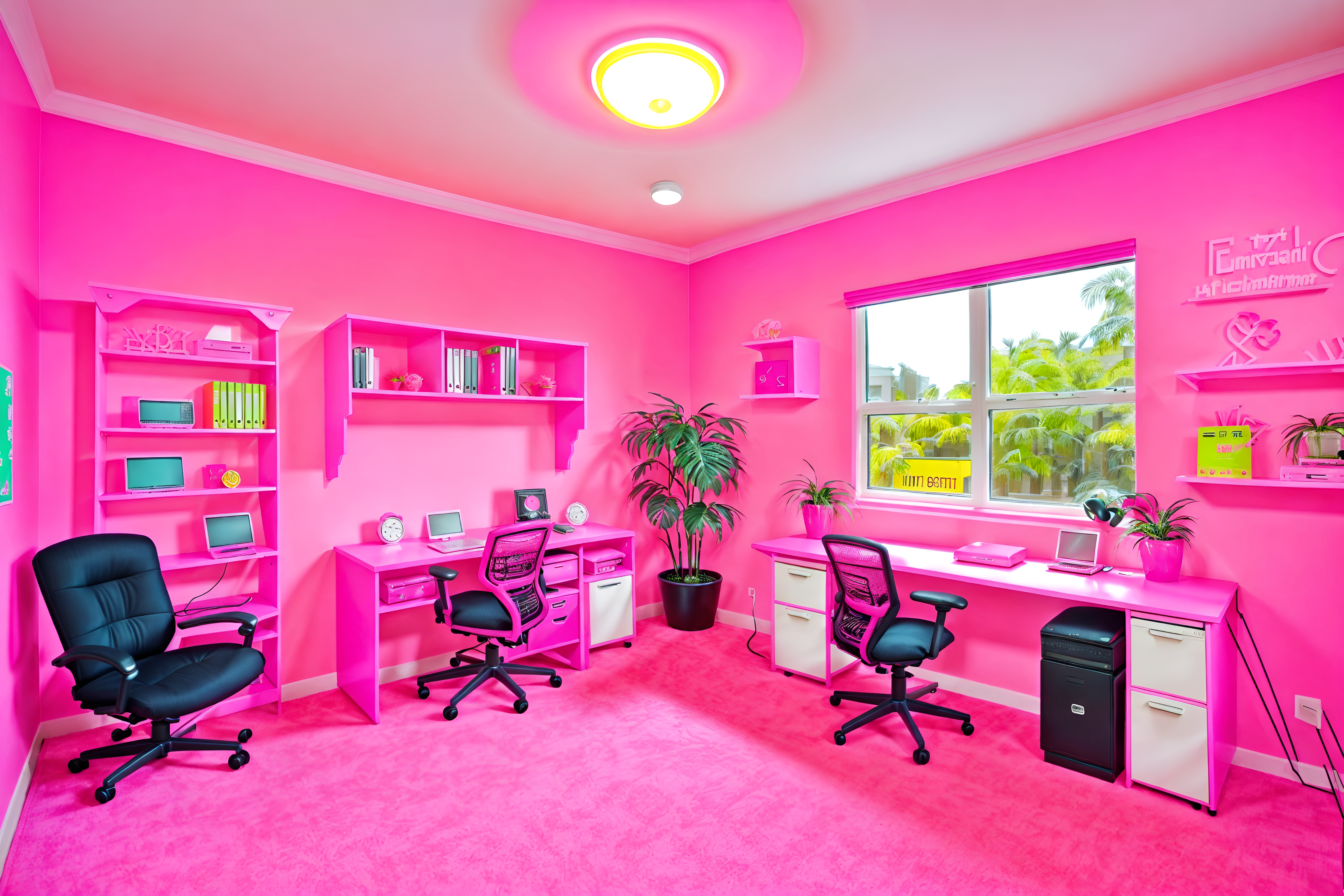 photo from pinterest of hot pink-style interior designed (office interior) with cabinets and computer desks and seating area with sofa and office desks and windows and lounge chairs and office chairs and plants. . with barbie style interior and barbie closet and barbie sofa and barbie chairs and hot pink barbie walls and hot pink barbie colors and barbie plastic interior and barbie bold rosy hues like fuchsia and magenta. . cinematic photo, highly detailed, cinematic lighting, ultra-detailed, ultrarealistic, photorealism, 8k. trending on pinterest. hot pink interior design style. masterpiece, cinematic light, ultrarealistic+, photorealistic+, 8k, raw photo, realistic, sharp focus on eyes, (symmetrical eyes), (intact eyes), hyperrealistic, highest quality, best quality, , highly detailed, masterpiece, best quality, extremely detailed 8k wallpaper, masterpiece, best quality, ultra-detailed, best shadow, detailed background, detailed face, detailed eyes, high contrast, best illumination, detailed face, dulux, caustic, dynamic angle, detailed glow. dramatic lighting. highly detailed, insanely detailed hair, symmetrical, intricate details, professionally retouched, 8k high definition. strong bokeh. award winning photo.