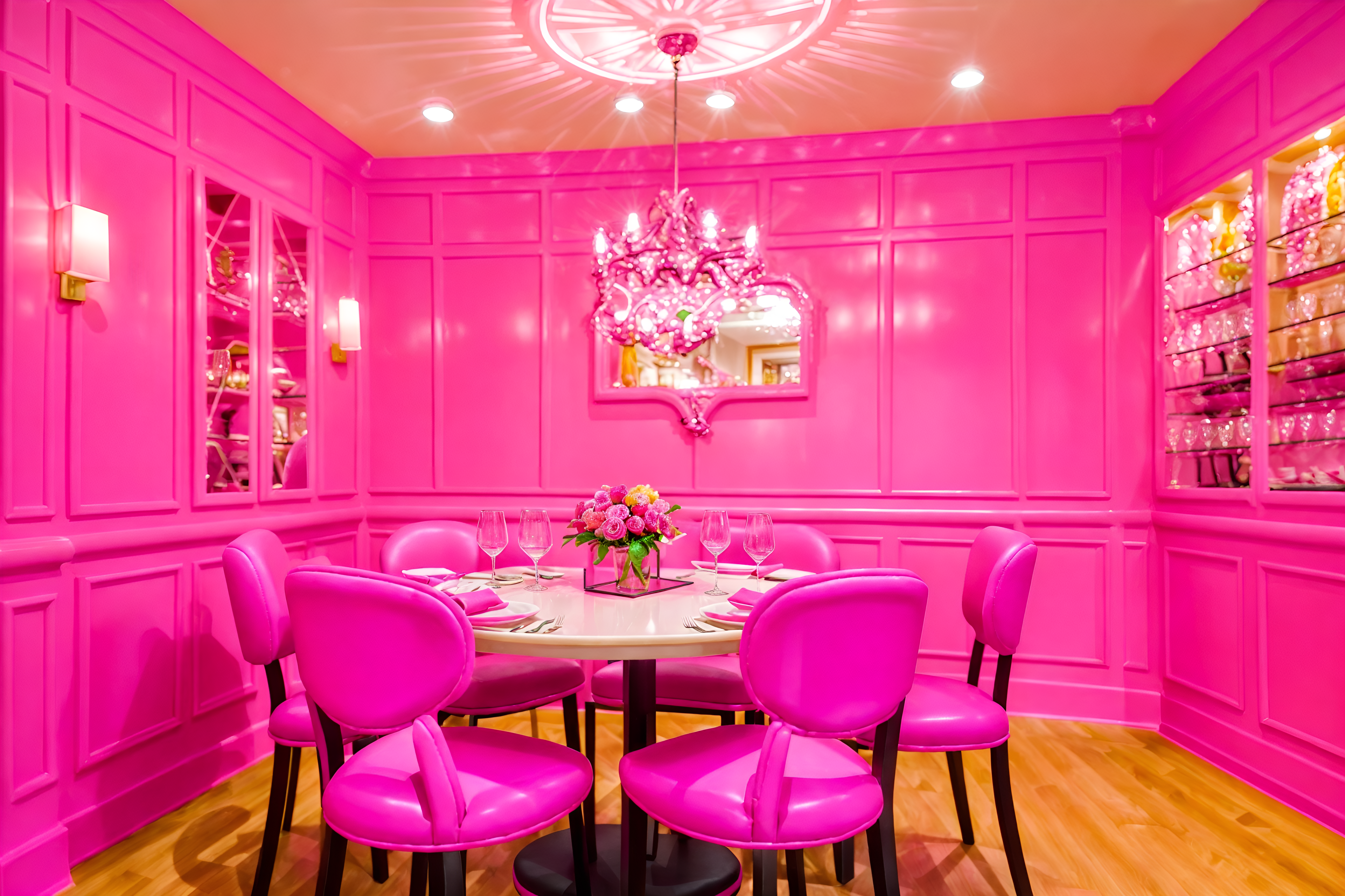 photo from pinterest of hot pink-style interior designed (restaurant interior) with restaurant dining tables and restaurant chairs and restaurant bar and restaurant decor and restaurant dining tables. . with barbie bold rosy hues like fuchsia and magenta and barbie sofa and barbie glitter and sparkle and hot pink barbie walls and hot pink barbie colors and barbie style interior and barbie closet and barbie plastic interior. . cinematic photo, highly detailed, cinematic lighting, ultra-detailed, ultrarealistic, photorealism, 8k. trending on pinterest. hot pink interior design style. masterpiece, cinematic light, ultrarealistic+, photorealistic+, 8k, raw photo, realistic, sharp focus on eyes, (symmetrical eyes), (intact eyes), hyperrealistic, highest quality, best quality, , highly detailed, masterpiece, best quality, extremely detailed 8k wallpaper, masterpiece, best quality, ultra-detailed, best shadow, detailed background, detailed face, detailed eyes, high contrast, best illumination, detailed face, dulux, caustic, dynamic angle, detailed glow. dramatic lighting. highly detailed, insanely detailed hair, symmetrical, intricate details, professionally retouched, 8k high definition. strong bokeh. award winning photo.
