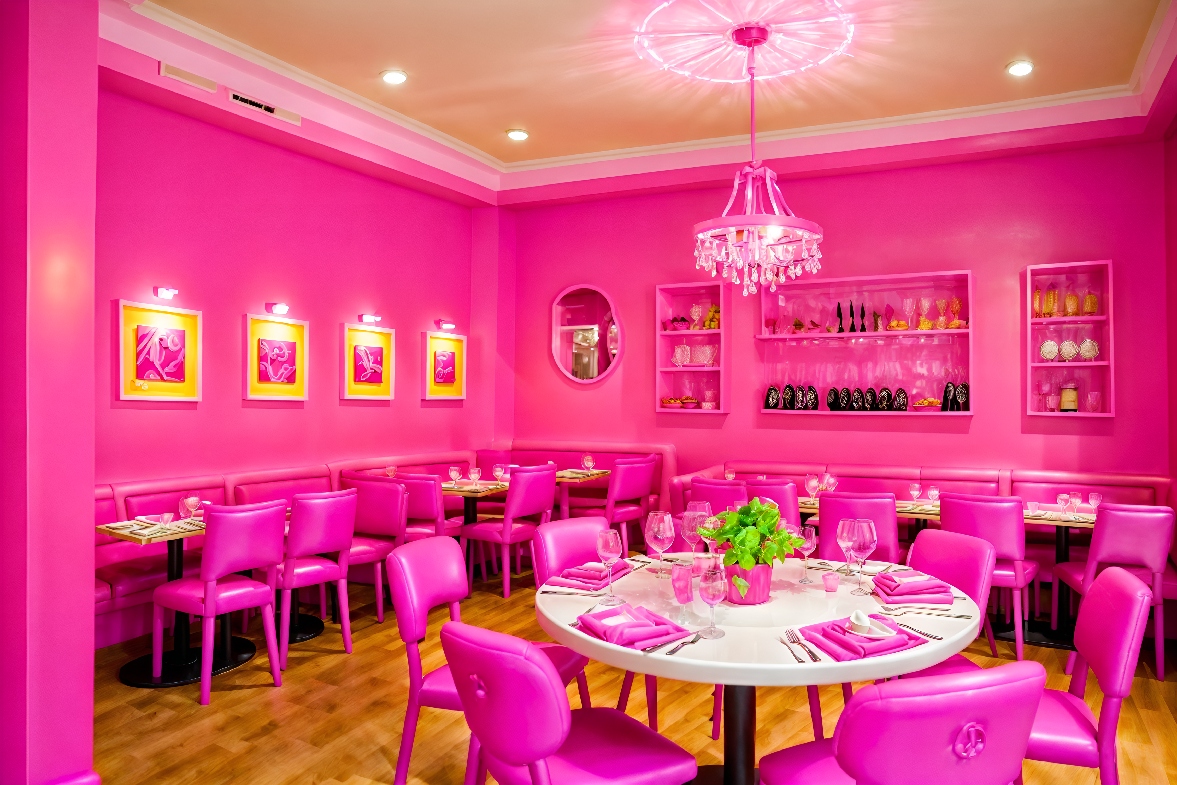 photo from pinterest of hot pink-style interior designed (restaurant interior) with restaurant dining tables and restaurant chairs and restaurant bar and restaurant decor and restaurant dining tables. . with barbie bold rosy hues like fuchsia and magenta and barbie sofa and barbie glitter and sparkle and hot pink barbie walls and hot pink barbie colors and barbie style interior and barbie closet and barbie plastic interior. . cinematic photo, highly detailed, cinematic lighting, ultra-detailed, ultrarealistic, photorealism, 8k. trending on pinterest. hot pink interior design style. masterpiece, cinematic light, ultrarealistic+, photorealistic+, 8k, raw photo, realistic, sharp focus on eyes, (symmetrical eyes), (intact eyes), hyperrealistic, highest quality, best quality, , highly detailed, masterpiece, best quality, extremely detailed 8k wallpaper, masterpiece, best quality, ultra-detailed, best shadow, detailed background, detailed face, detailed eyes, high contrast, best illumination, detailed face, dulux, caustic, dynamic angle, detailed glow. dramatic lighting. highly detailed, insanely detailed hair, symmetrical, intricate details, professionally retouched, 8k high definition. strong bokeh. award winning photo.