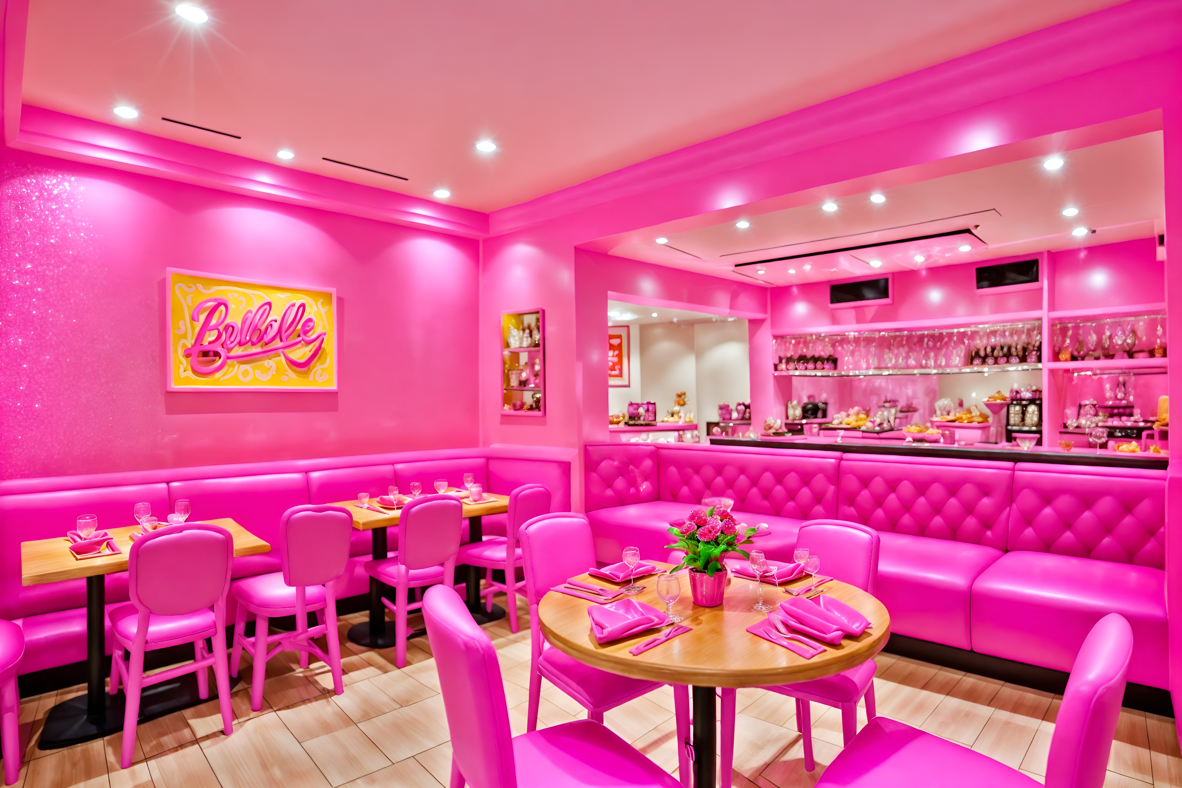 photo from pinterest of hot pink-style interior designed (restaurant interior) with restaurant dining tables and restaurant chairs and restaurant bar and restaurant decor and restaurant dining tables. . with barbie bold rosy hues like fuchsia and magenta and barbie sofa and barbie glitter and sparkle and hot pink barbie walls and hot pink barbie colors and barbie style interior and barbie closet and barbie plastic interior. . cinematic photo, highly detailed, cinematic lighting, ultra-detailed, ultrarealistic, photorealism, 8k. trending on pinterest. hot pink interior design style. masterpiece, cinematic light, ultrarealistic+, photorealistic+, 8k, raw photo, realistic, sharp focus on eyes, (symmetrical eyes), (intact eyes), hyperrealistic, highest quality, best quality, , highly detailed, masterpiece, best quality, extremely detailed 8k wallpaper, masterpiece, best quality, ultra-detailed, best shadow, detailed background, detailed face, detailed eyes, high contrast, best illumination, detailed face, dulux, caustic, dynamic angle, detailed glow. dramatic lighting. highly detailed, insanely detailed hair, symmetrical, intricate details, professionally retouched, 8k high definition. strong bokeh. award winning photo.