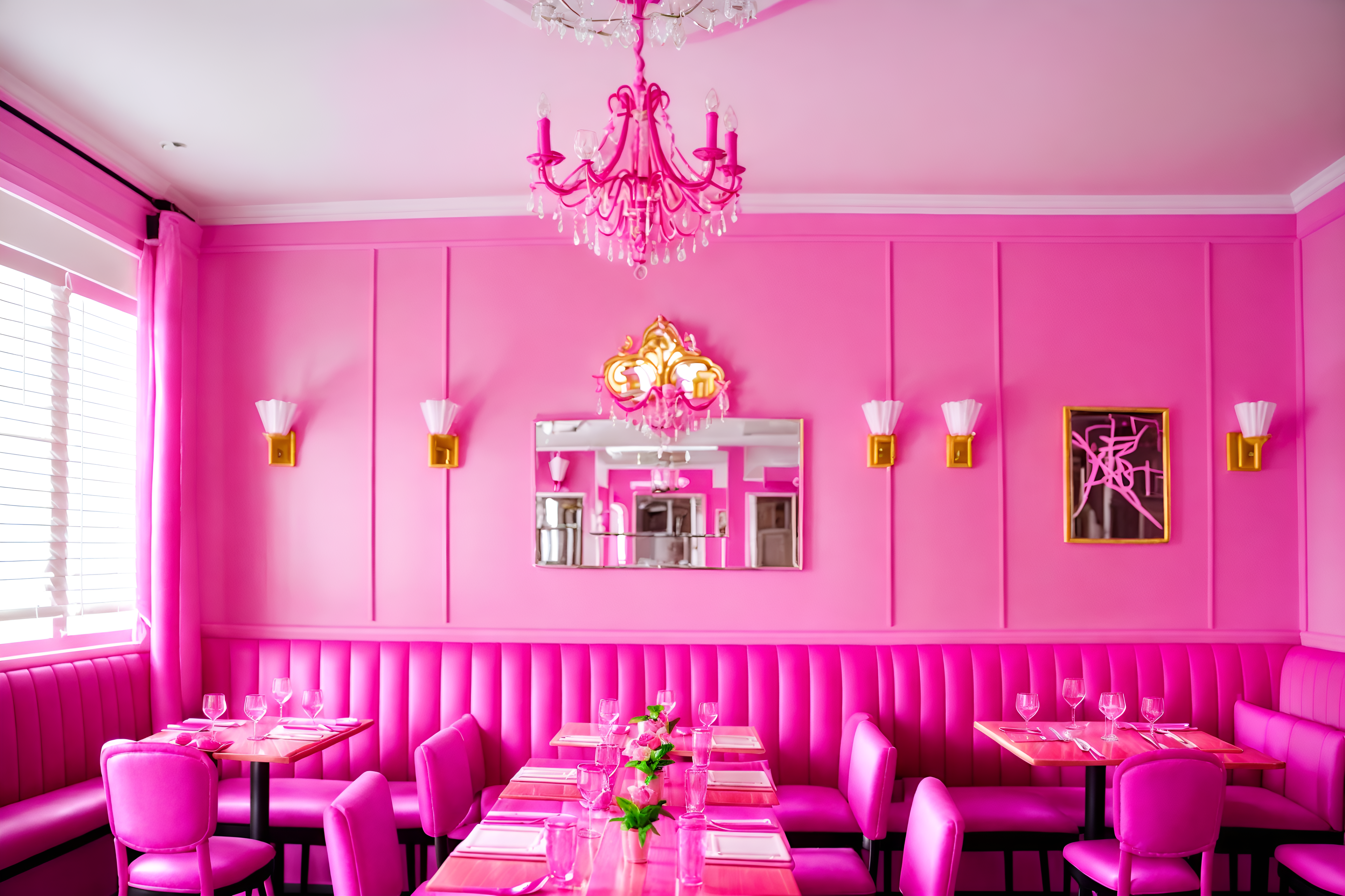 photo from pinterest of hot pink-style interior designed (restaurant interior) with restaurant dining tables and restaurant chairs and restaurant bar and restaurant decor and restaurant dining tables. . with barbie bold rosy hues like fuchsia and magenta and barbie sofa and barbie glitter and sparkle and hot pink barbie walls and hot pink barbie colors and barbie style interior and barbie closet and barbie plastic interior. . cinematic photo, highly detailed, cinematic lighting, ultra-detailed, ultrarealistic, photorealism, 8k. trending on pinterest. hot pink interior design style. masterpiece, cinematic light, ultrarealistic+, photorealistic+, 8k, raw photo, realistic, sharp focus on eyes, (symmetrical eyes), (intact eyes), hyperrealistic, highest quality, best quality, , highly detailed, masterpiece, best quality, extremely detailed 8k wallpaper, masterpiece, best quality, ultra-detailed, best shadow, detailed background, detailed face, detailed eyes, high contrast, best illumination, detailed face, dulux, caustic, dynamic angle, detailed glow. dramatic lighting. highly detailed, insanely detailed hair, symmetrical, intricate details, professionally retouched, 8k high definition. strong bokeh. award winning photo.
