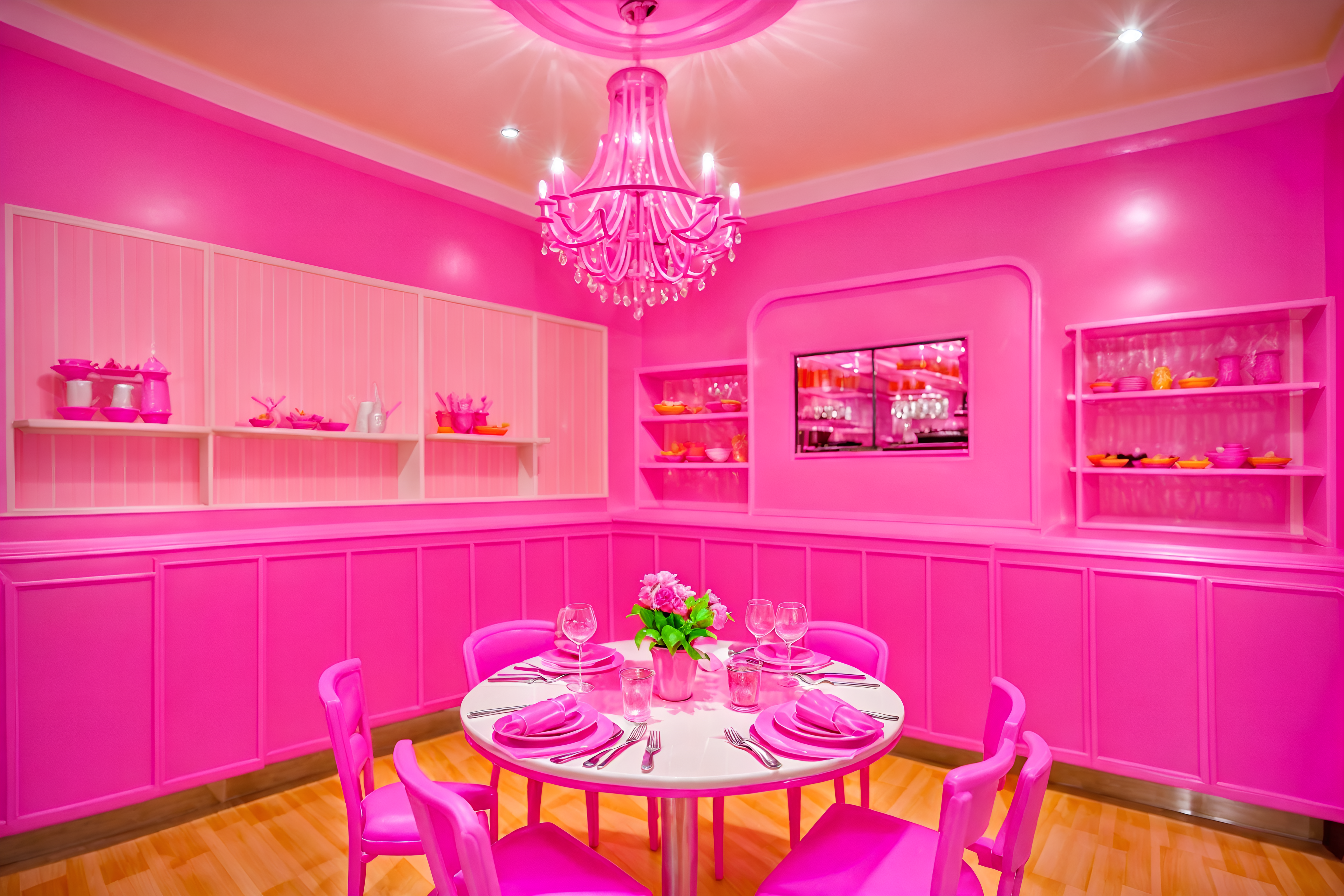 photo from pinterest of hot pink-style interior designed (restaurant interior) with restaurant dining tables and restaurant chairs and restaurant bar and restaurant decor and restaurant dining tables. . with barbie bold rosy hues like fuchsia and magenta and barbie sofa and barbie glitter and sparkle and hot pink barbie walls and hot pink barbie colors and barbie style interior and barbie closet and barbie plastic interior. . cinematic photo, highly detailed, cinematic lighting, ultra-detailed, ultrarealistic, photorealism, 8k. trending on pinterest. hot pink interior design style. masterpiece, cinematic light, ultrarealistic+, photorealistic+, 8k, raw photo, realistic, sharp focus on eyes, (symmetrical eyes), (intact eyes), hyperrealistic, highest quality, best quality, , highly detailed, masterpiece, best quality, extremely detailed 8k wallpaper, masterpiece, best quality, ultra-detailed, best shadow, detailed background, detailed face, detailed eyes, high contrast, best illumination, detailed face, dulux, caustic, dynamic angle, detailed glow. dramatic lighting. highly detailed, insanely detailed hair, symmetrical, intricate details, professionally retouched, 8k high definition. strong bokeh. award winning photo.