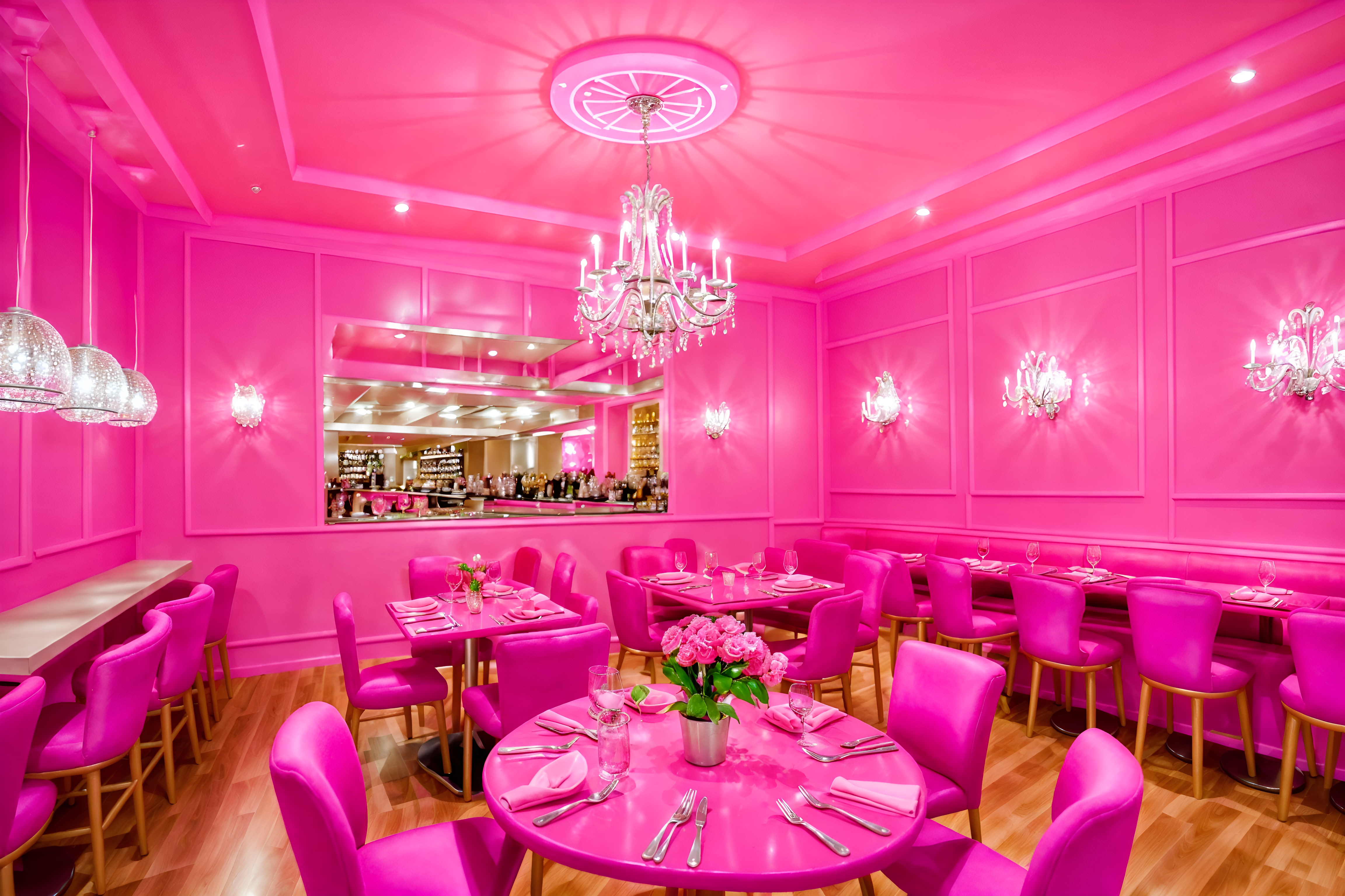 photo from pinterest of hot pink-style interior designed (restaurant interior) with restaurant dining tables and restaurant chairs and restaurant bar and restaurant decor and restaurant dining tables. . with barbie bold rosy hues like fuchsia and magenta and barbie sofa and barbie glitter and sparkle and hot pink barbie walls and hot pink barbie colors and barbie style interior and barbie closet and barbie plastic interior. . cinematic photo, highly detailed, cinematic lighting, ultra-detailed, ultrarealistic, photorealism, 8k. trending on pinterest. hot pink interior design style. masterpiece, cinematic light, ultrarealistic+, photorealistic+, 8k, raw photo, realistic, sharp focus on eyes, (symmetrical eyes), (intact eyes), hyperrealistic, highest quality, best quality, , highly detailed, masterpiece, best quality, extremely detailed 8k wallpaper, masterpiece, best quality, ultra-detailed, best shadow, detailed background, detailed face, detailed eyes, high contrast, best illumination, detailed face, dulux, caustic, dynamic angle, detailed glow. dramatic lighting. highly detailed, insanely detailed hair, symmetrical, intricate details, professionally retouched, 8k high definition. strong bokeh. award winning photo.