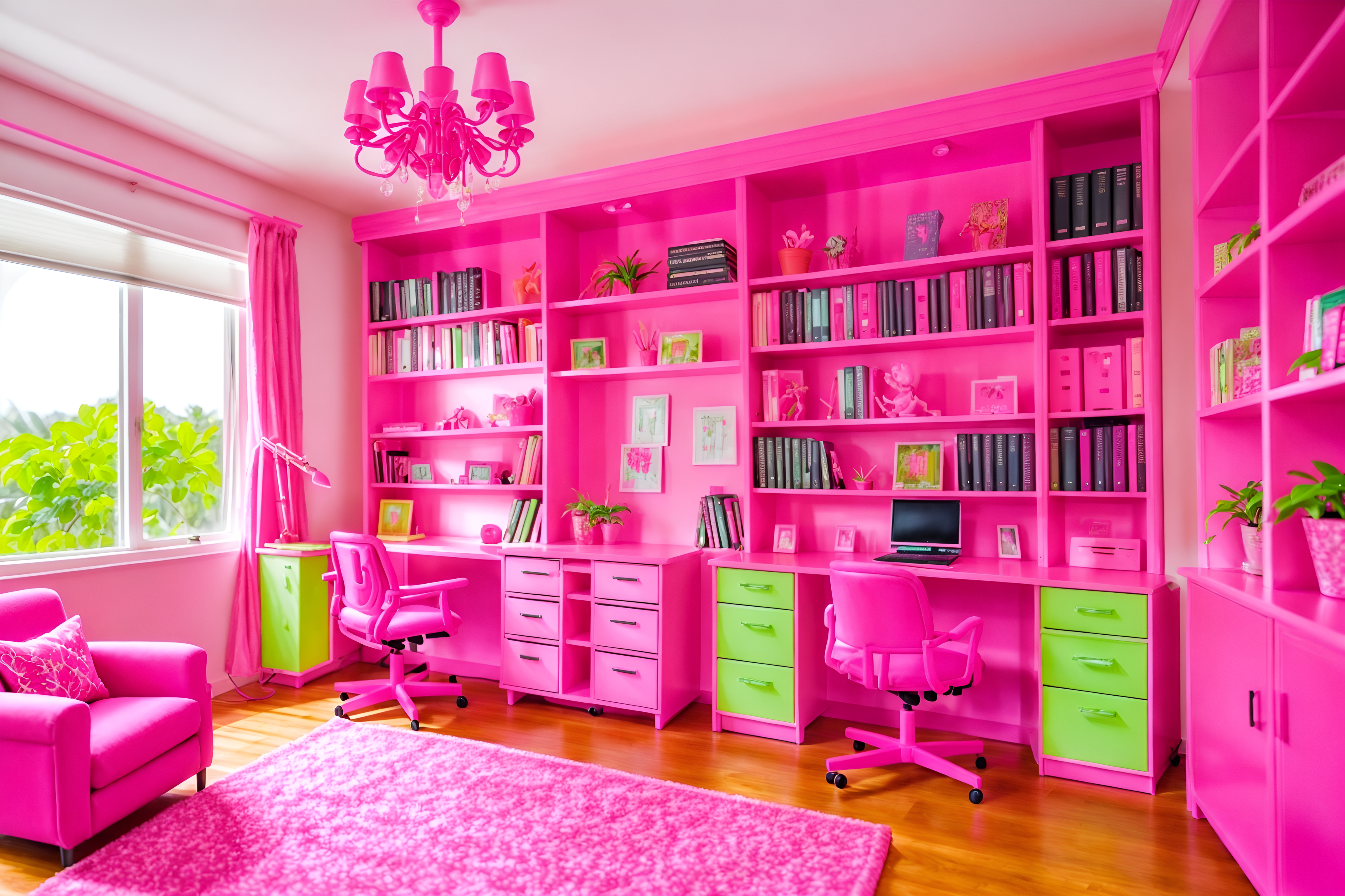 photo from pinterest of hot pink-style interior designed (study room interior) with plant and bookshelves and lounge chair and cabinets and office chair and writing desk and desk lamp and plant. . with barbie sofa and barbie bold rosy hues like fuchsia and magenta and barbie glitter and sparkle and barbie plastic interior and hot pink barbie walls and barbie chairs and hot pink barbie colors and barbie closet. . cinematic photo, highly detailed, cinematic lighting, ultra-detailed, ultrarealistic, photorealism, 8k. trending on pinterest. hot pink interior design style. masterpiece, cinematic light, ultrarealistic+, photorealistic+, 8k, raw photo, realistic, sharp focus on eyes, (symmetrical eyes), (intact eyes), hyperrealistic, highest quality, best quality, , highly detailed, masterpiece, best quality, extremely detailed 8k wallpaper, masterpiece, best quality, ultra-detailed, best shadow, detailed background, detailed face, detailed eyes, high contrast, best illumination, detailed face, dulux, caustic, dynamic angle, detailed glow. dramatic lighting. highly detailed, insanely detailed hair, symmetrical, intricate details, professionally retouched, 8k high definition. strong bokeh. award winning photo.