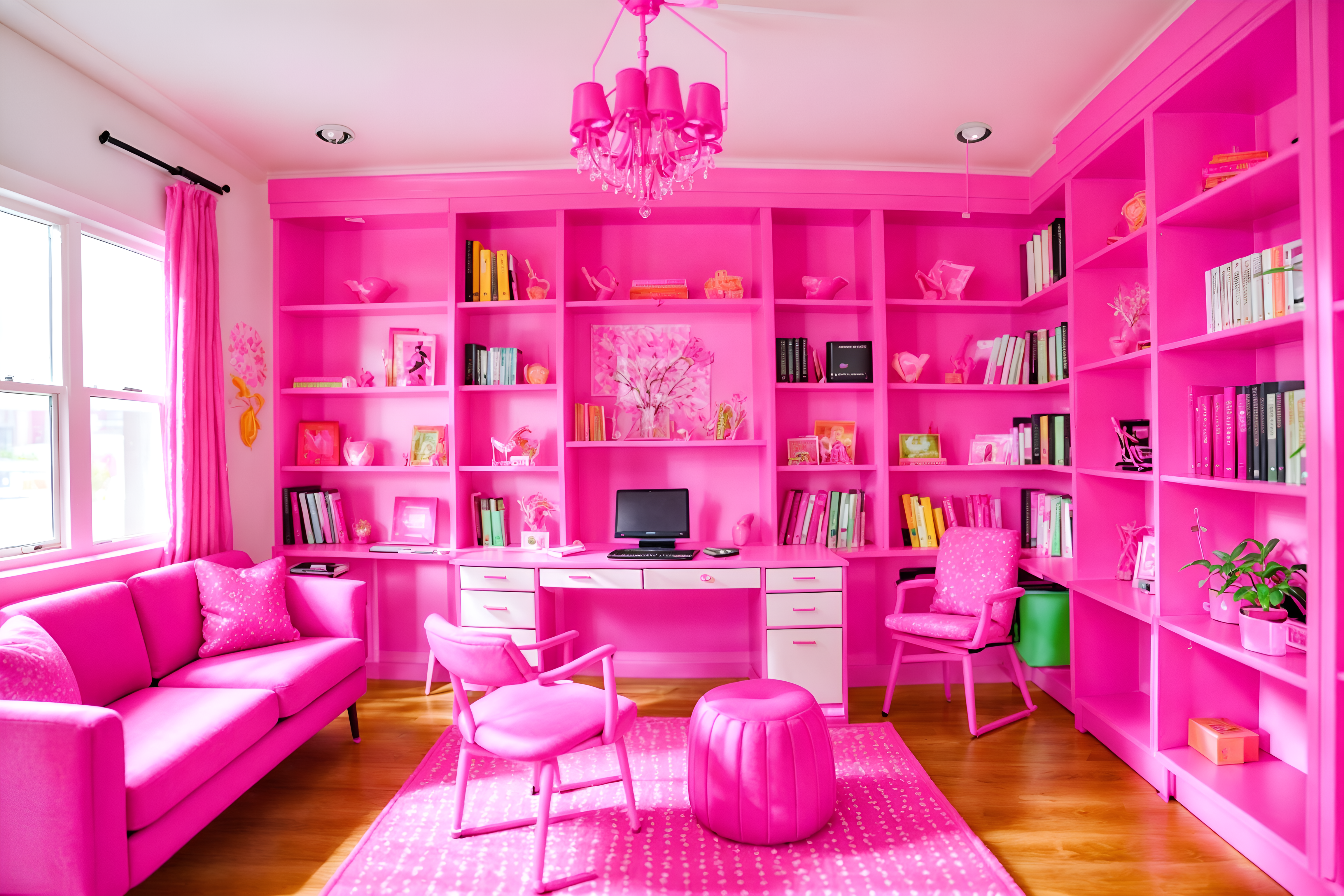 photo from pinterest of hot pink-style interior designed (study room interior) with plant and bookshelves and lounge chair and cabinets and office chair and writing desk and desk lamp and plant. . with barbie sofa and barbie bold rosy hues like fuchsia and magenta and barbie glitter and sparkle and barbie plastic interior and hot pink barbie walls and barbie chairs and hot pink barbie colors and barbie closet. . cinematic photo, highly detailed, cinematic lighting, ultra-detailed, ultrarealistic, photorealism, 8k. trending on pinterest. hot pink interior design style. masterpiece, cinematic light, ultrarealistic+, photorealistic+, 8k, raw photo, realistic, sharp focus on eyes, (symmetrical eyes), (intact eyes), hyperrealistic, highest quality, best quality, , highly detailed, masterpiece, best quality, extremely detailed 8k wallpaper, masterpiece, best quality, ultra-detailed, best shadow, detailed background, detailed face, detailed eyes, high contrast, best illumination, detailed face, dulux, caustic, dynamic angle, detailed glow. dramatic lighting. highly detailed, insanely detailed hair, symmetrical, intricate details, professionally retouched, 8k high definition. strong bokeh. award winning photo.