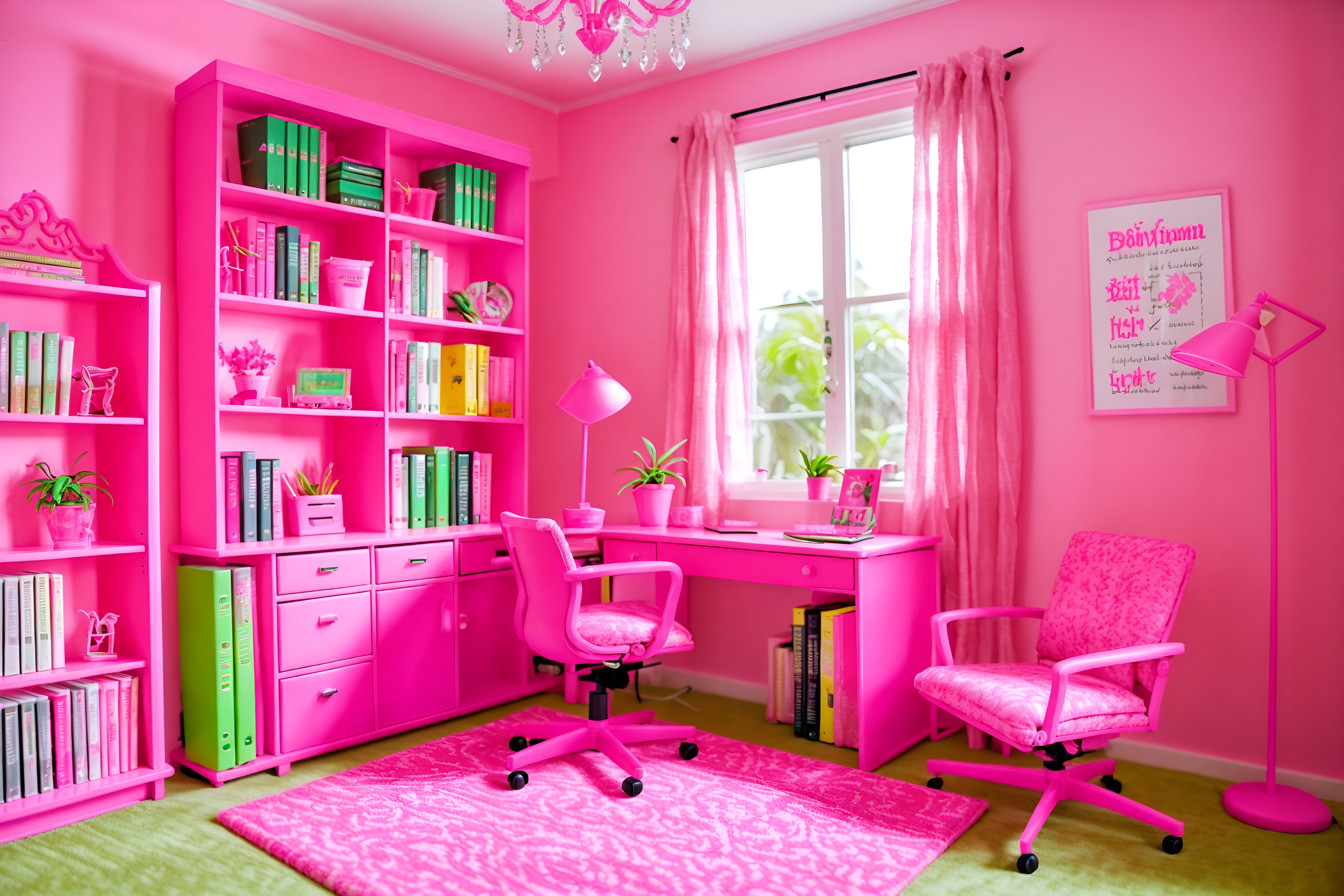 photo from pinterest of hot pink-style interior designed (study room interior) with plant and bookshelves and lounge chair and cabinets and office chair and writing desk and desk lamp and plant. . with barbie sofa and barbie bold rosy hues like fuchsia and magenta and barbie glitter and sparkle and barbie plastic interior and hot pink barbie walls and barbie chairs and hot pink barbie colors and barbie closet. . cinematic photo, highly detailed, cinematic lighting, ultra-detailed, ultrarealistic, photorealism, 8k. trending on pinterest. hot pink interior design style. masterpiece, cinematic light, ultrarealistic+, photorealistic+, 8k, raw photo, realistic, sharp focus on eyes, (symmetrical eyes), (intact eyes), hyperrealistic, highest quality, best quality, , highly detailed, masterpiece, best quality, extremely detailed 8k wallpaper, masterpiece, best quality, ultra-detailed, best shadow, detailed background, detailed face, detailed eyes, high contrast, best illumination, detailed face, dulux, caustic, dynamic angle, detailed glow. dramatic lighting. highly detailed, insanely detailed hair, symmetrical, intricate details, professionally retouched, 8k high definition. strong bokeh. award winning photo.