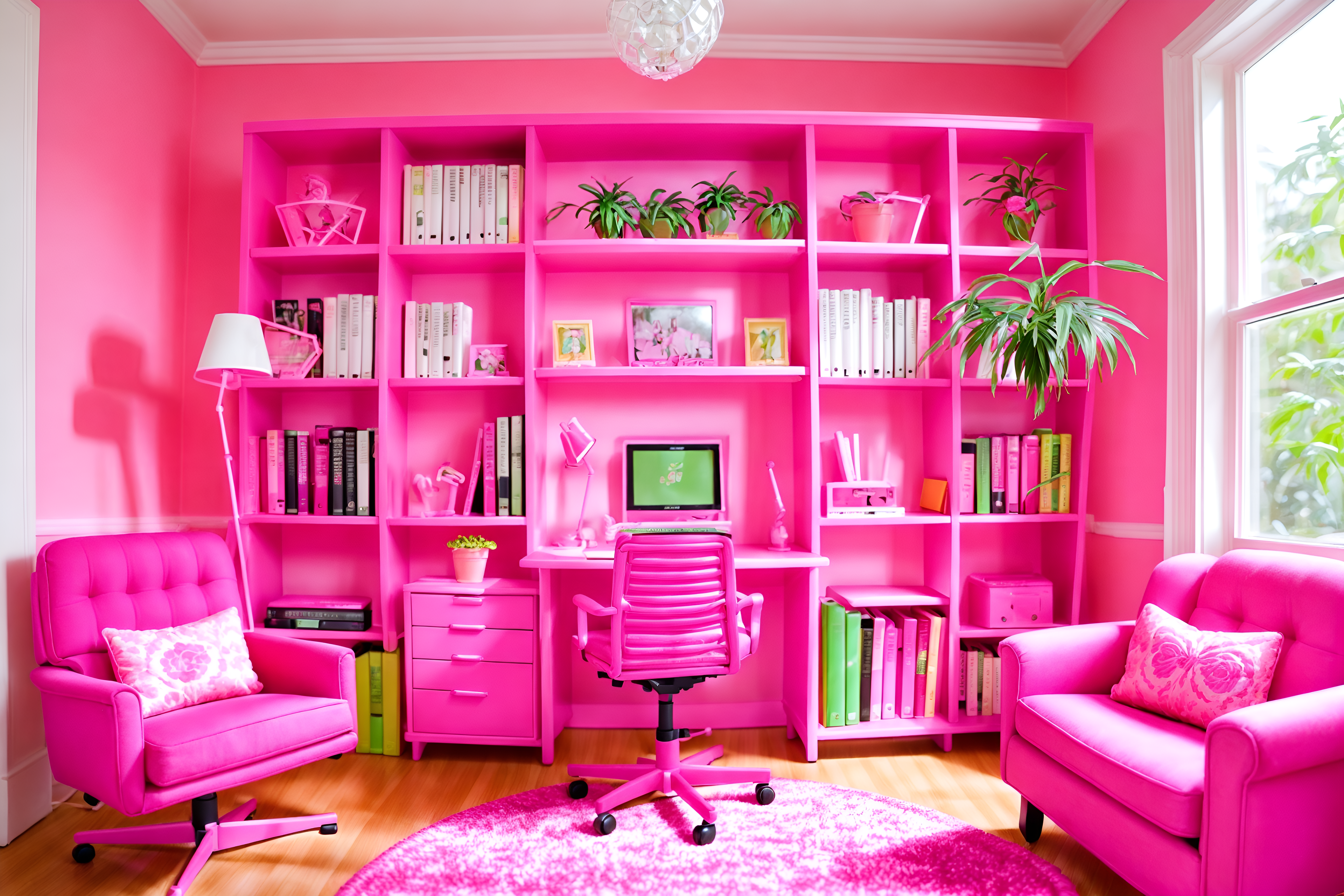photo from pinterest of hot pink-style interior designed (study room interior) with plant and bookshelves and lounge chair and cabinets and office chair and writing desk and desk lamp and plant. . with barbie sofa and barbie bold rosy hues like fuchsia and magenta and barbie glitter and sparkle and barbie plastic interior and hot pink barbie walls and barbie chairs and hot pink barbie colors and barbie closet. . cinematic photo, highly detailed, cinematic lighting, ultra-detailed, ultrarealistic, photorealism, 8k. trending on pinterest. hot pink interior design style. masterpiece, cinematic light, ultrarealistic+, photorealistic+, 8k, raw photo, realistic, sharp focus on eyes, (symmetrical eyes), (intact eyes), hyperrealistic, highest quality, best quality, , highly detailed, masterpiece, best quality, extremely detailed 8k wallpaper, masterpiece, best quality, ultra-detailed, best shadow, detailed background, detailed face, detailed eyes, high contrast, best illumination, detailed face, dulux, caustic, dynamic angle, detailed glow. dramatic lighting. highly detailed, insanely detailed hair, symmetrical, intricate details, professionally retouched, 8k high definition. strong bokeh. award winning photo.