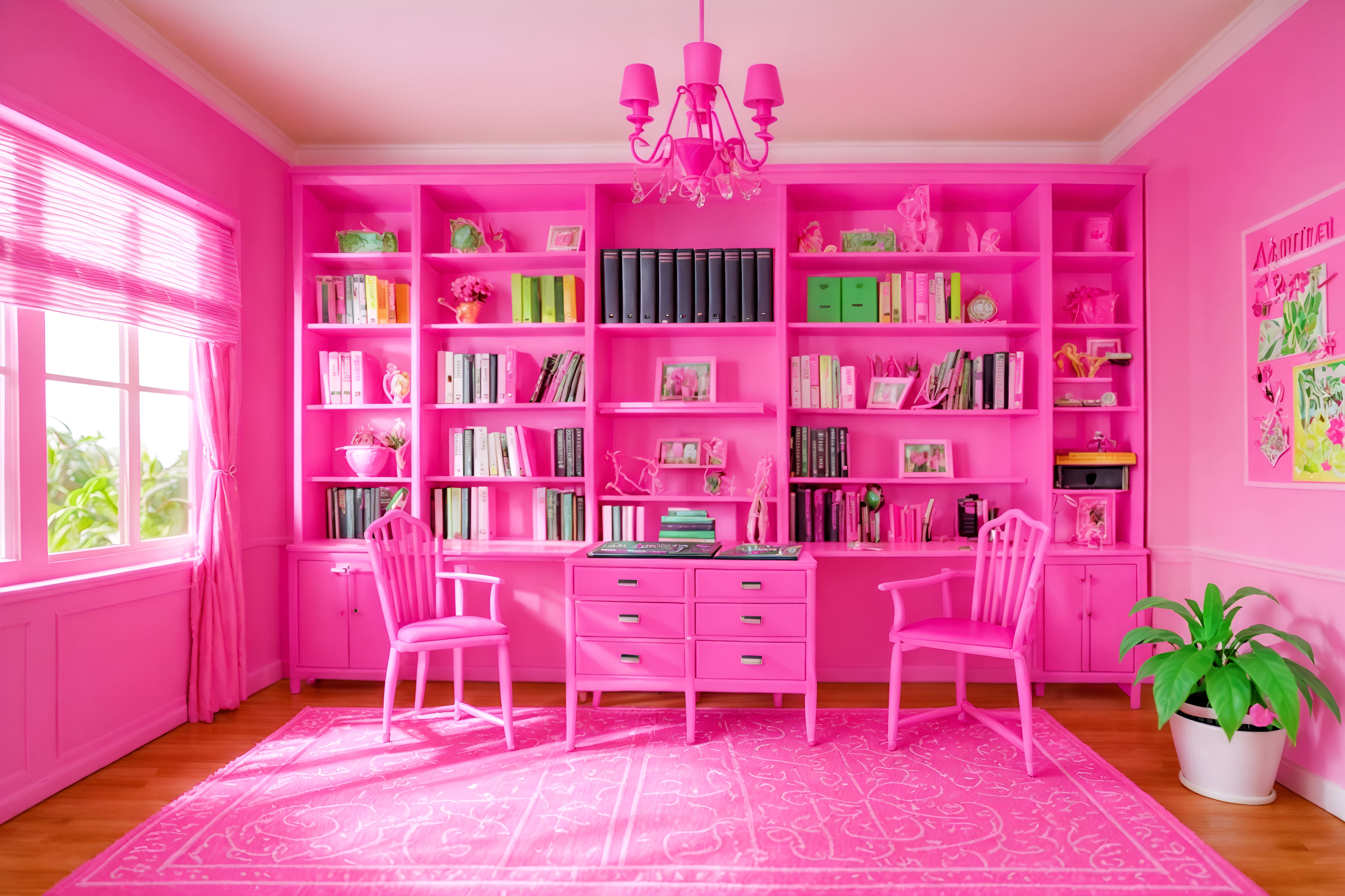 photo from pinterest of hot pink-style interior designed (study room interior) with plant and bookshelves and lounge chair and cabinets and office chair and writing desk and desk lamp and plant. . with barbie sofa and barbie bold rosy hues like fuchsia and magenta and barbie glitter and sparkle and barbie plastic interior and hot pink barbie walls and barbie chairs and hot pink barbie colors and barbie closet. . cinematic photo, highly detailed, cinematic lighting, ultra-detailed, ultrarealistic, photorealism, 8k. trending on pinterest. hot pink interior design style. masterpiece, cinematic light, ultrarealistic+, photorealistic+, 8k, raw photo, realistic, sharp focus on eyes, (symmetrical eyes), (intact eyes), hyperrealistic, highest quality, best quality, , highly detailed, masterpiece, best quality, extremely detailed 8k wallpaper, masterpiece, best quality, ultra-detailed, best shadow, detailed background, detailed face, detailed eyes, high contrast, best illumination, detailed face, dulux, caustic, dynamic angle, detailed glow. dramatic lighting. highly detailed, insanely detailed hair, symmetrical, intricate details, professionally retouched, 8k high definition. strong bokeh. award winning photo.