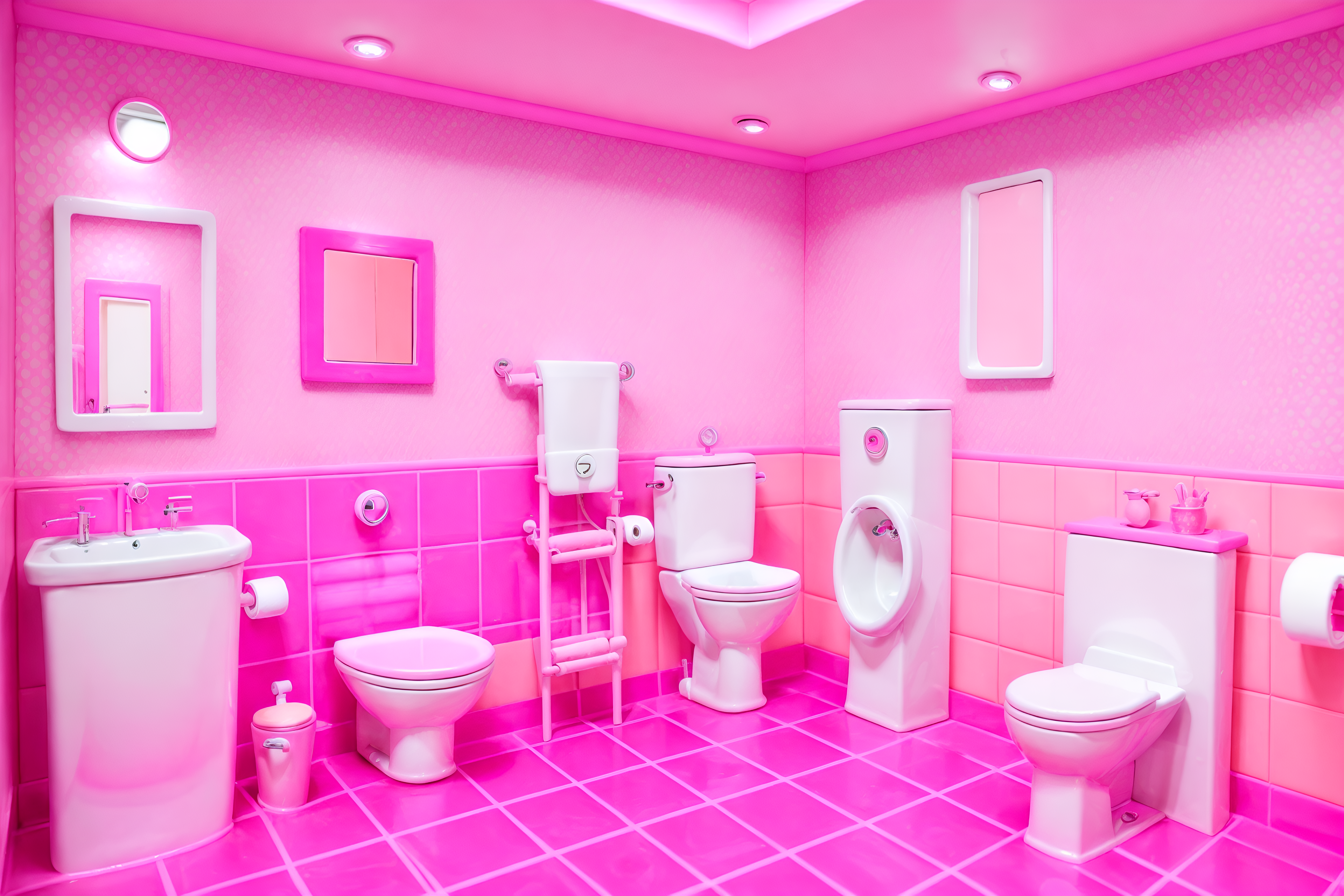 photo from pinterest of hot pink-style interior designed (toilet interior) with sink with tap and toilet with toilet seat up and toilet paper hanger and sink with tap. . with barbie style interior and barbie bold rosy hues like fuchsia and magenta and hot pink barbie walls and hot pink barbie colors and barbie glitter and sparkle and barbie chairs and barbie sofa and barbie closet. . cinematic photo, highly detailed, cinematic lighting, ultra-detailed, ultrarealistic, photorealism, 8k. trending on pinterest. hot pink interior design style. masterpiece, cinematic light, ultrarealistic+, photorealistic+, 8k, raw photo, realistic, sharp focus on eyes, (symmetrical eyes), (intact eyes), hyperrealistic, highest quality, best quality, , highly detailed, masterpiece, best quality, extremely detailed 8k wallpaper, masterpiece, best quality, ultra-detailed, best shadow, detailed background, detailed face, detailed eyes, high contrast, best illumination, detailed face, dulux, caustic, dynamic angle, detailed glow. dramatic lighting. highly detailed, insanely detailed hair, symmetrical, intricate details, professionally retouched, 8k high definition. strong bokeh. award winning photo.