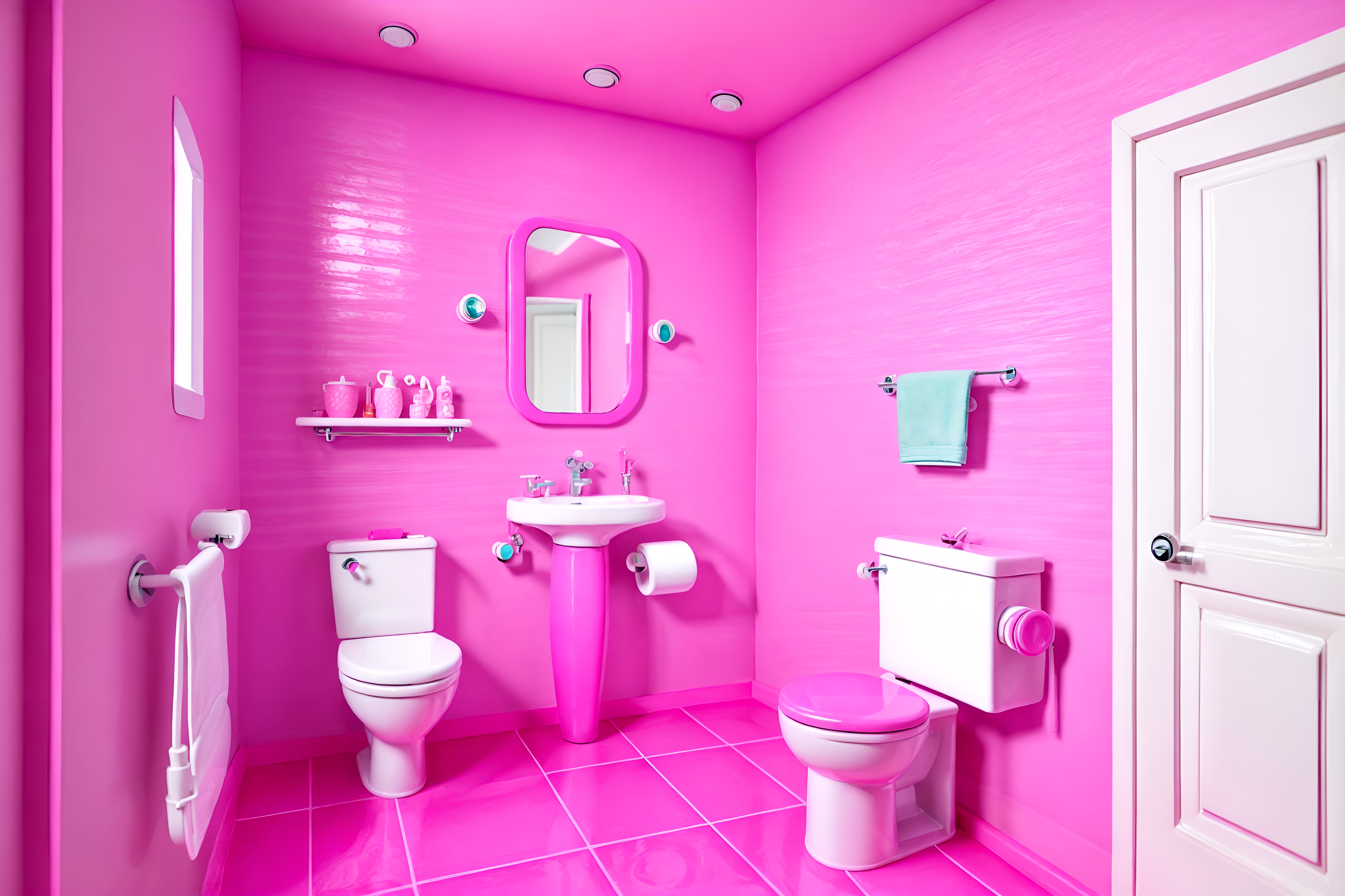 photo from pinterest of hot pink-style interior designed (toilet interior) with sink with tap and toilet with toilet seat up and toilet paper hanger and sink with tap. . with barbie style interior and barbie bold rosy hues like fuchsia and magenta and hot pink barbie walls and hot pink barbie colors and barbie glitter and sparkle and barbie chairs and barbie sofa and barbie closet. . cinematic photo, highly detailed, cinematic lighting, ultra-detailed, ultrarealistic, photorealism, 8k. trending on pinterest. hot pink interior design style. masterpiece, cinematic light, ultrarealistic+, photorealistic+, 8k, raw photo, realistic, sharp focus on eyes, (symmetrical eyes), (intact eyes), hyperrealistic, highest quality, best quality, , highly detailed, masterpiece, best quality, extremely detailed 8k wallpaper, masterpiece, best quality, ultra-detailed, best shadow, detailed background, detailed face, detailed eyes, high contrast, best illumination, detailed face, dulux, caustic, dynamic angle, detailed glow. dramatic lighting. highly detailed, insanely detailed hair, symmetrical, intricate details, professionally retouched, 8k high definition. strong bokeh. award winning photo.