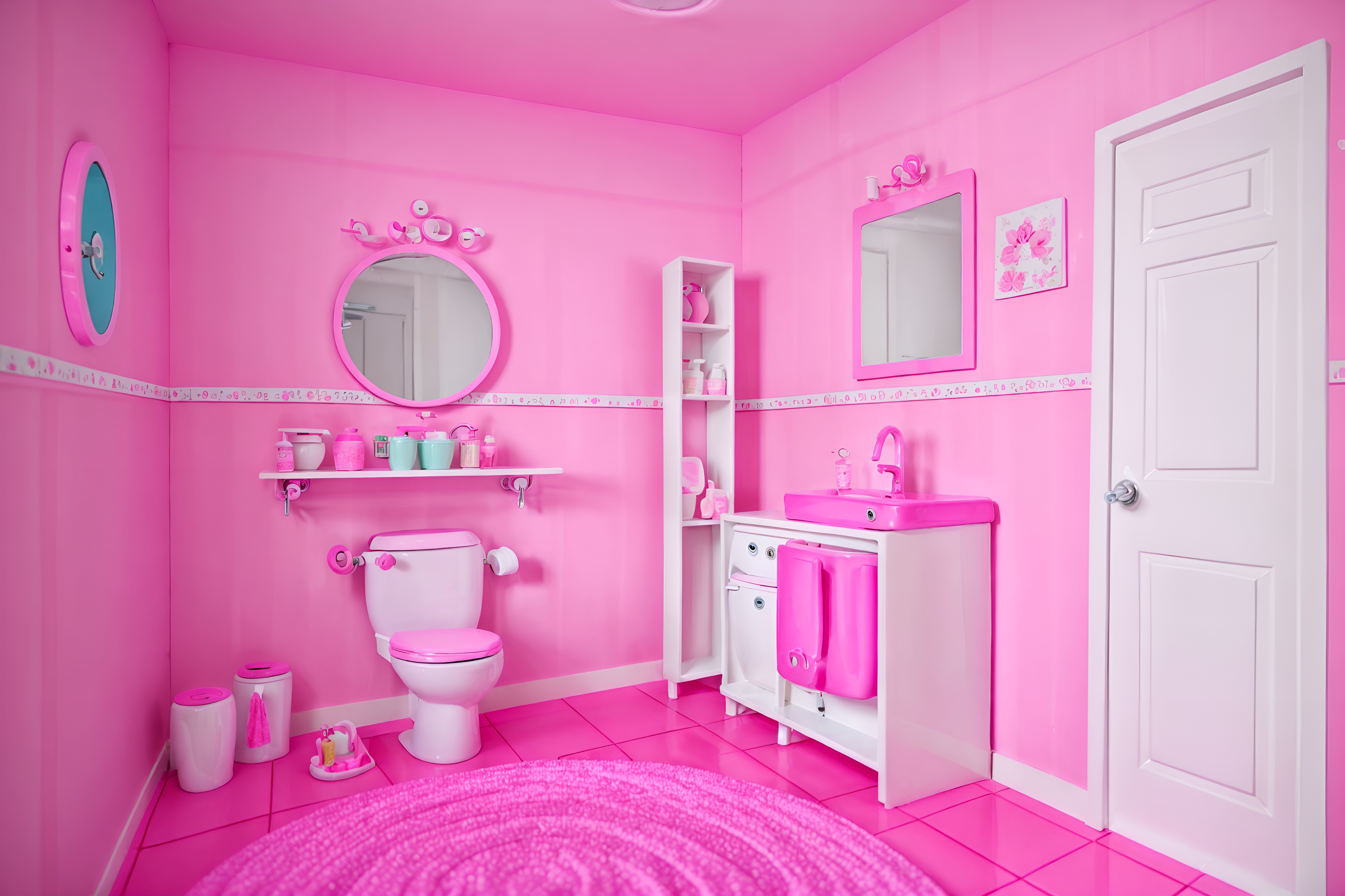 photo from pinterest of hot pink-style interior designed (toilet interior) with sink with tap and toilet with toilet seat up and toilet paper hanger and sink with tap. . with barbie style interior and barbie bold rosy hues like fuchsia and magenta and hot pink barbie walls and hot pink barbie colors and barbie glitter and sparkle and barbie chairs and barbie sofa and barbie closet. . cinematic photo, highly detailed, cinematic lighting, ultra-detailed, ultrarealistic, photorealism, 8k. trending on pinterest. hot pink interior design style. masterpiece, cinematic light, ultrarealistic+, photorealistic+, 8k, raw photo, realistic, sharp focus on eyes, (symmetrical eyes), (intact eyes), hyperrealistic, highest quality, best quality, , highly detailed, masterpiece, best quality, extremely detailed 8k wallpaper, masterpiece, best quality, ultra-detailed, best shadow, detailed background, detailed face, detailed eyes, high contrast, best illumination, detailed face, dulux, caustic, dynamic angle, detailed glow. dramatic lighting. highly detailed, insanely detailed hair, symmetrical, intricate details, professionally retouched, 8k high definition. strong bokeh. award winning photo.