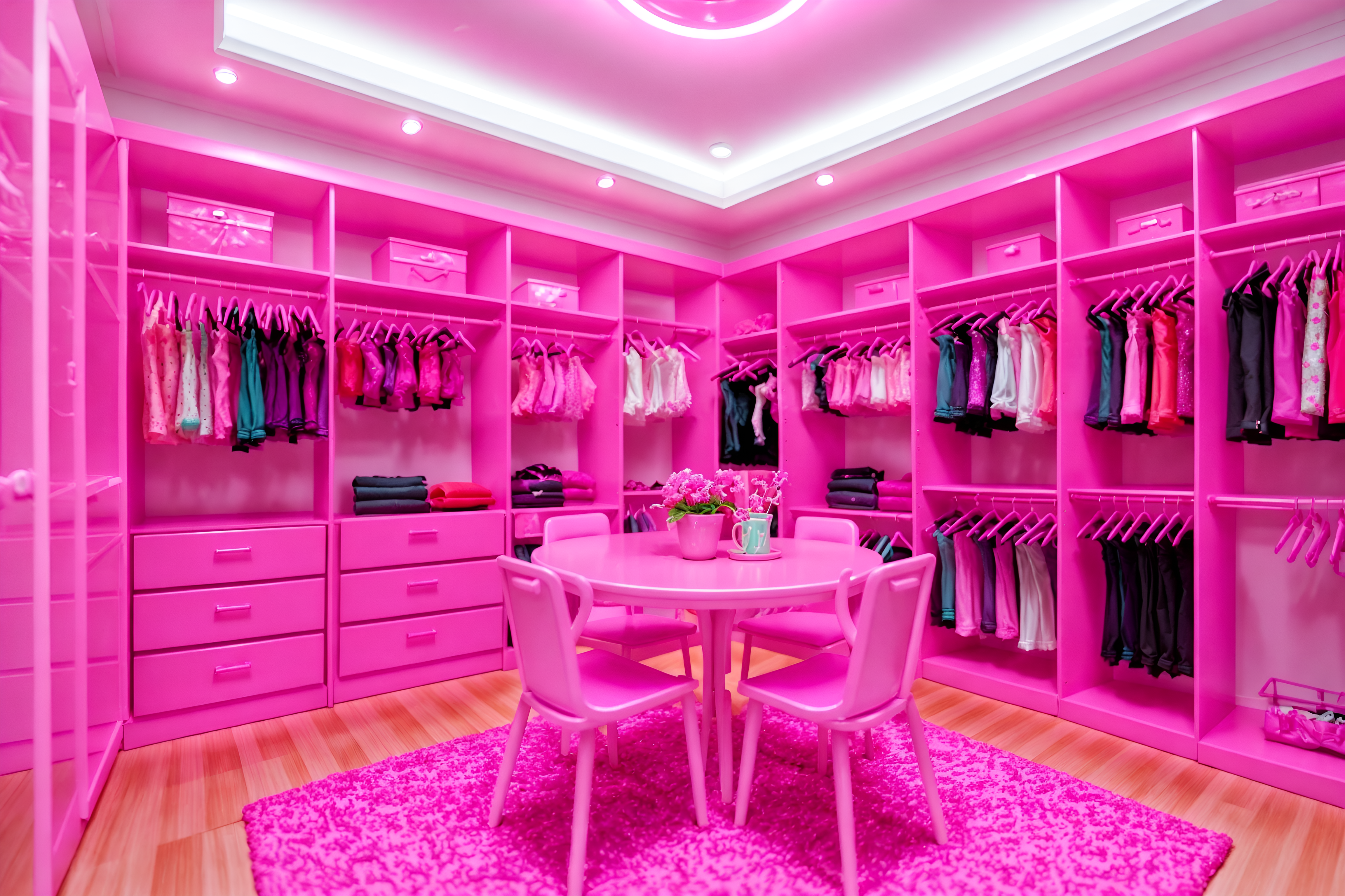 photo from pinterest of hot pink-style interior designed (walk in closet interior) . with barbie chairs and barbie sofa and barbie style interior and barbie glitter and sparkle and barbie closet and hot pink barbie colors and barbie plastic interior and barbie bold rosy hues like fuchsia and magenta. . cinematic photo, highly detailed, cinematic lighting, ultra-detailed, ultrarealistic, photorealism, 8k. trending on pinterest. hot pink interior design style. masterpiece, cinematic light, ultrarealistic+, photorealistic+, 8k, raw photo, realistic, sharp focus on eyes, (symmetrical eyes), (intact eyes), hyperrealistic, highest quality, best quality, , highly detailed, masterpiece, best quality, extremely detailed 8k wallpaper, masterpiece, best quality, ultra-detailed, best shadow, detailed background, detailed face, detailed eyes, high contrast, best illumination, detailed face, dulux, caustic, dynamic angle, detailed glow. dramatic lighting. highly detailed, insanely detailed hair, symmetrical, intricate details, professionally retouched, 8k high definition. strong bokeh. award winning photo.