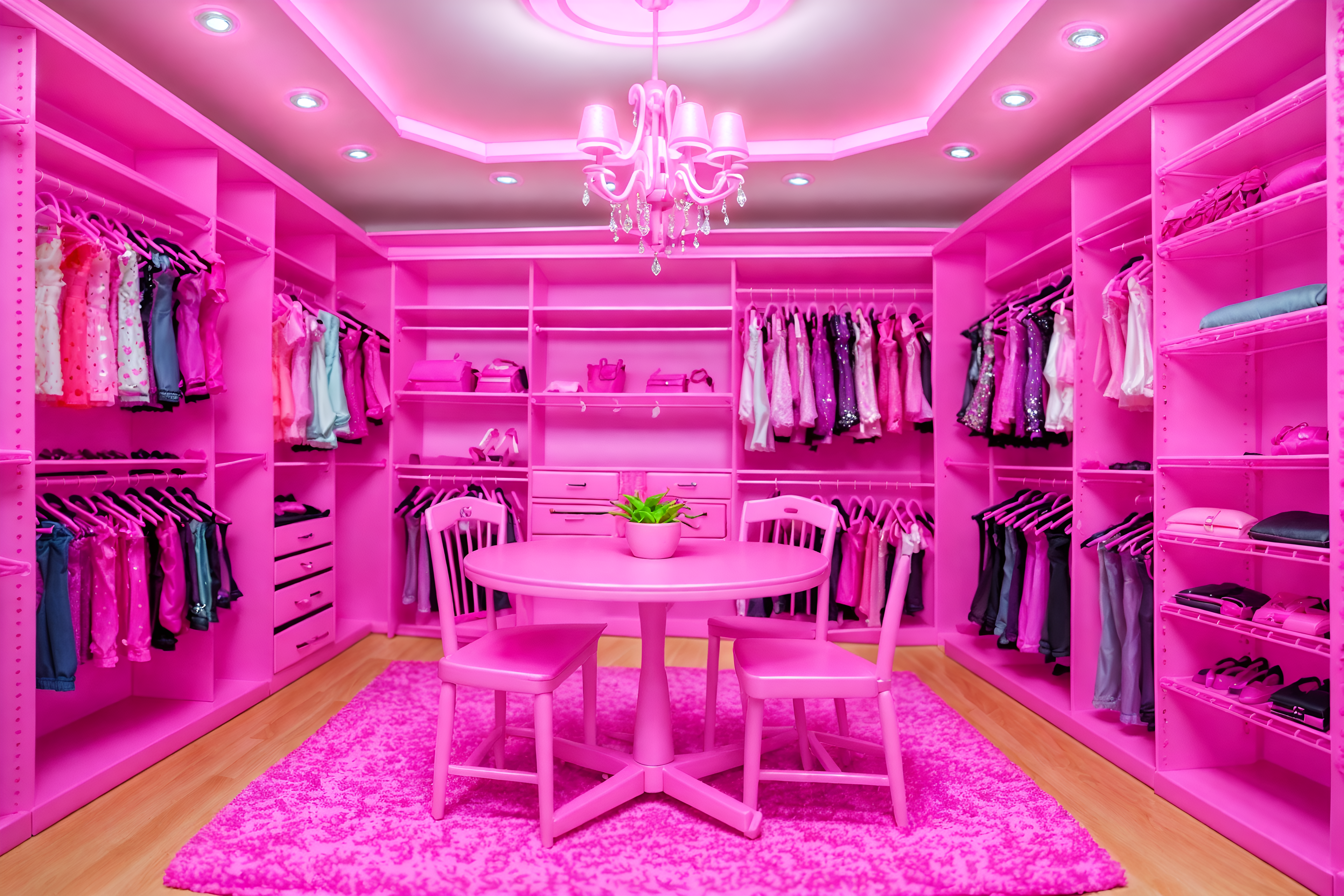 photo from pinterest of hot pink-style interior designed (walk in closet interior) . with barbie chairs and barbie sofa and barbie style interior and barbie glitter and sparkle and barbie closet and hot pink barbie colors and barbie plastic interior and barbie bold rosy hues like fuchsia and magenta. . cinematic photo, highly detailed, cinematic lighting, ultra-detailed, ultrarealistic, photorealism, 8k. trending on pinterest. hot pink interior design style. masterpiece, cinematic light, ultrarealistic+, photorealistic+, 8k, raw photo, realistic, sharp focus on eyes, (symmetrical eyes), (intact eyes), hyperrealistic, highest quality, best quality, , highly detailed, masterpiece, best quality, extremely detailed 8k wallpaper, masterpiece, best quality, ultra-detailed, best shadow, detailed background, detailed face, detailed eyes, high contrast, best illumination, detailed face, dulux, caustic, dynamic angle, detailed glow. dramatic lighting. highly detailed, insanely detailed hair, symmetrical, intricate details, professionally retouched, 8k high definition. strong bokeh. award winning photo.
