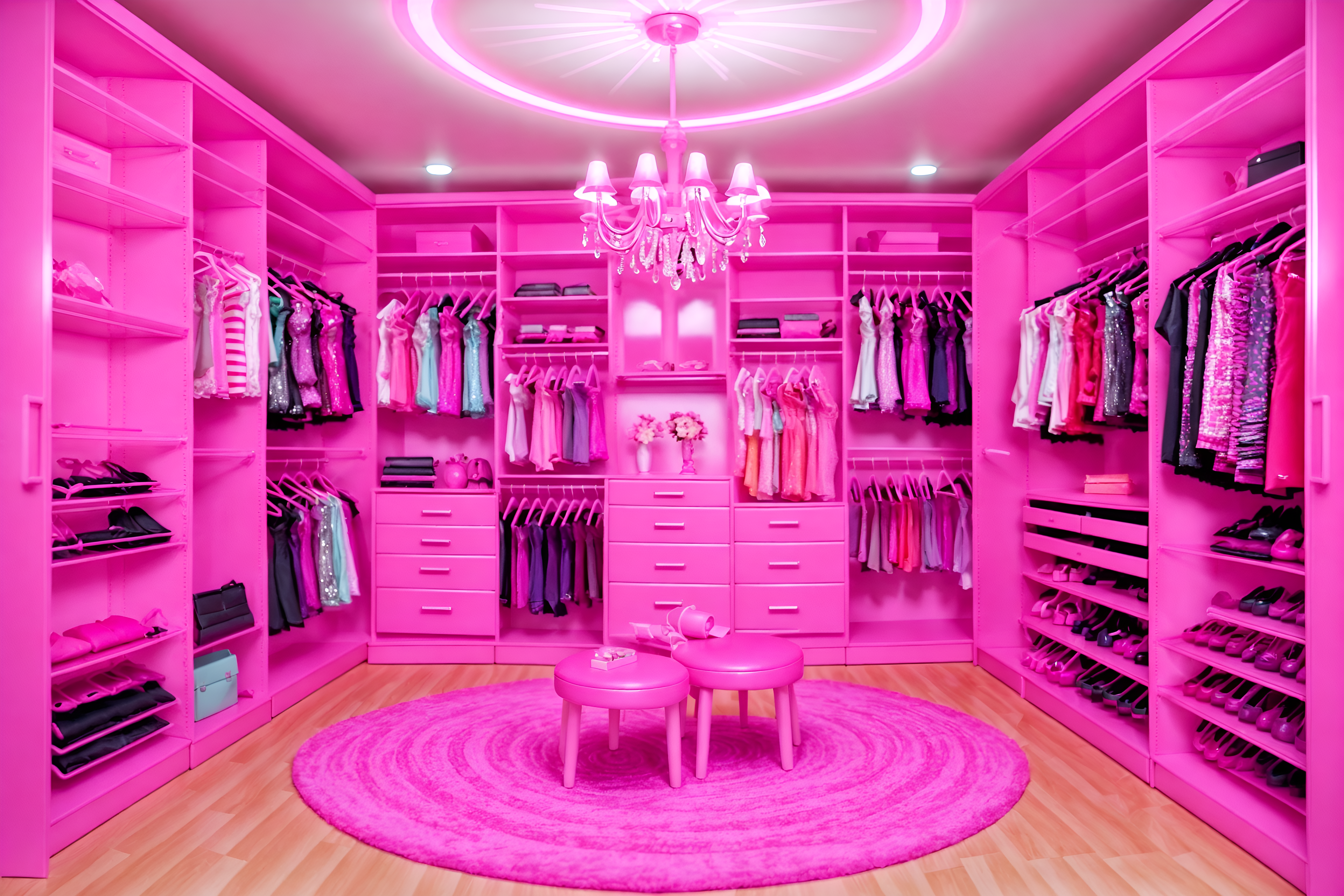 photo from pinterest of hot pink-style interior designed (walk in closet interior) . with barbie chairs and barbie sofa and barbie style interior and barbie glitter and sparkle and barbie closet and hot pink barbie colors and barbie plastic interior and barbie bold rosy hues like fuchsia and magenta. . cinematic photo, highly detailed, cinematic lighting, ultra-detailed, ultrarealistic, photorealism, 8k. trending on pinterest. hot pink interior design style. masterpiece, cinematic light, ultrarealistic+, photorealistic+, 8k, raw photo, realistic, sharp focus on eyes, (symmetrical eyes), (intact eyes), hyperrealistic, highest quality, best quality, , highly detailed, masterpiece, best quality, extremely detailed 8k wallpaper, masterpiece, best quality, ultra-detailed, best shadow, detailed background, detailed face, detailed eyes, high contrast, best illumination, detailed face, dulux, caustic, dynamic angle, detailed glow. dramatic lighting. highly detailed, insanely detailed hair, symmetrical, intricate details, professionally retouched, 8k high definition. strong bokeh. award winning photo.