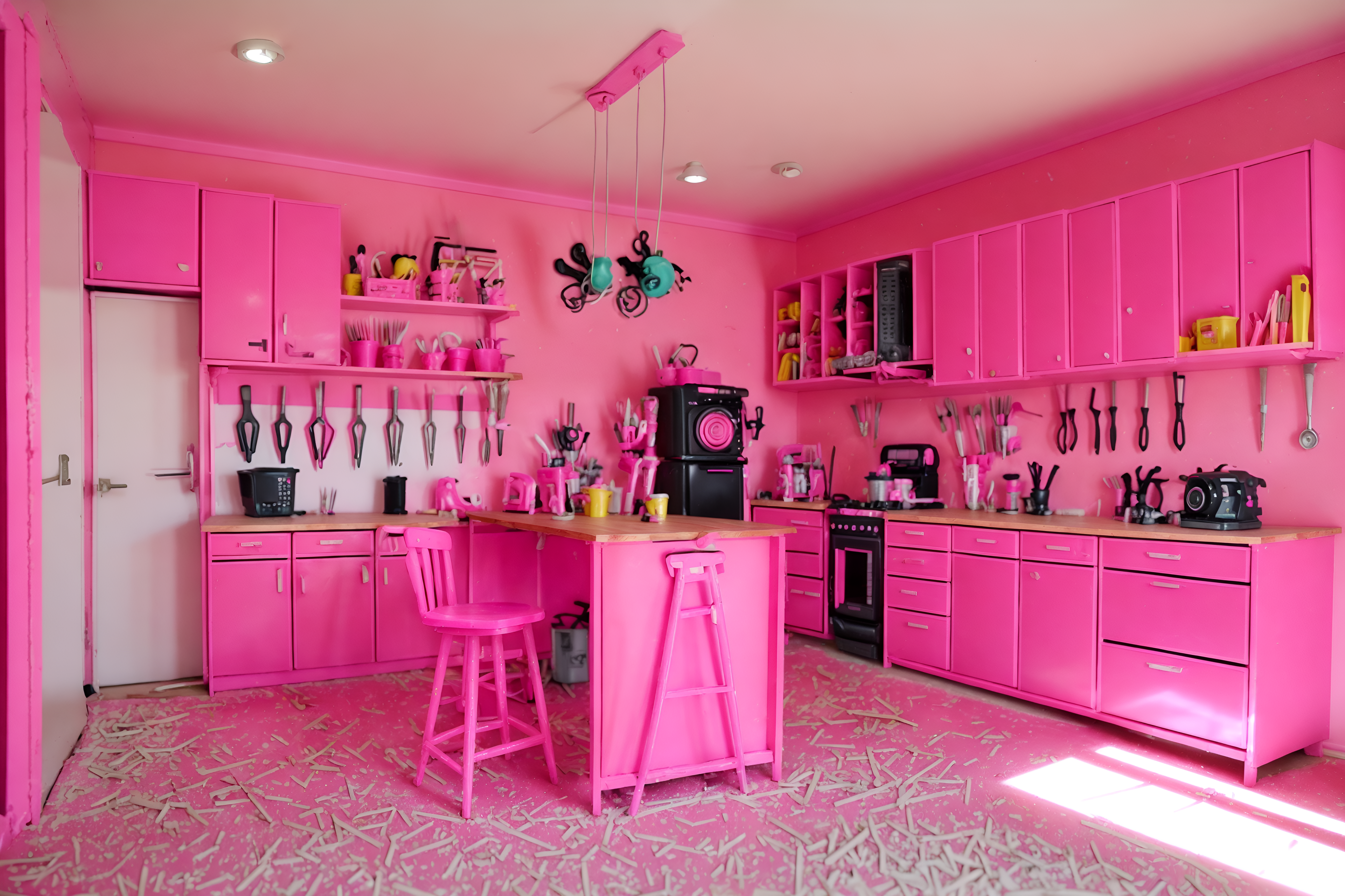 photo from pinterest of hot pink-style interior designed (workshop interior) with messy and tool wall and wooden workbench and messy. . with barbie style interior and barbie chairs and barbie glitter and sparkle and hot pink barbie colors and barbie closet and barbie plastic interior and hot pink barbie walls and barbie bold rosy hues like fuchsia and magenta. . cinematic photo, highly detailed, cinematic lighting, ultra-detailed, ultrarealistic, photorealism, 8k. trending on pinterest. hot pink interior design style. masterpiece, cinematic light, ultrarealistic+, photorealistic+, 8k, raw photo, realistic, sharp focus on eyes, (symmetrical eyes), (intact eyes), hyperrealistic, highest quality, best quality, , highly detailed, masterpiece, best quality, extremely detailed 8k wallpaper, masterpiece, best quality, ultra-detailed, best shadow, detailed background, detailed face, detailed eyes, high contrast, best illumination, detailed face, dulux, caustic, dynamic angle, detailed glow. dramatic lighting. highly detailed, insanely detailed hair, symmetrical, intricate details, professionally retouched, 8k high definition. strong bokeh. award winning photo.