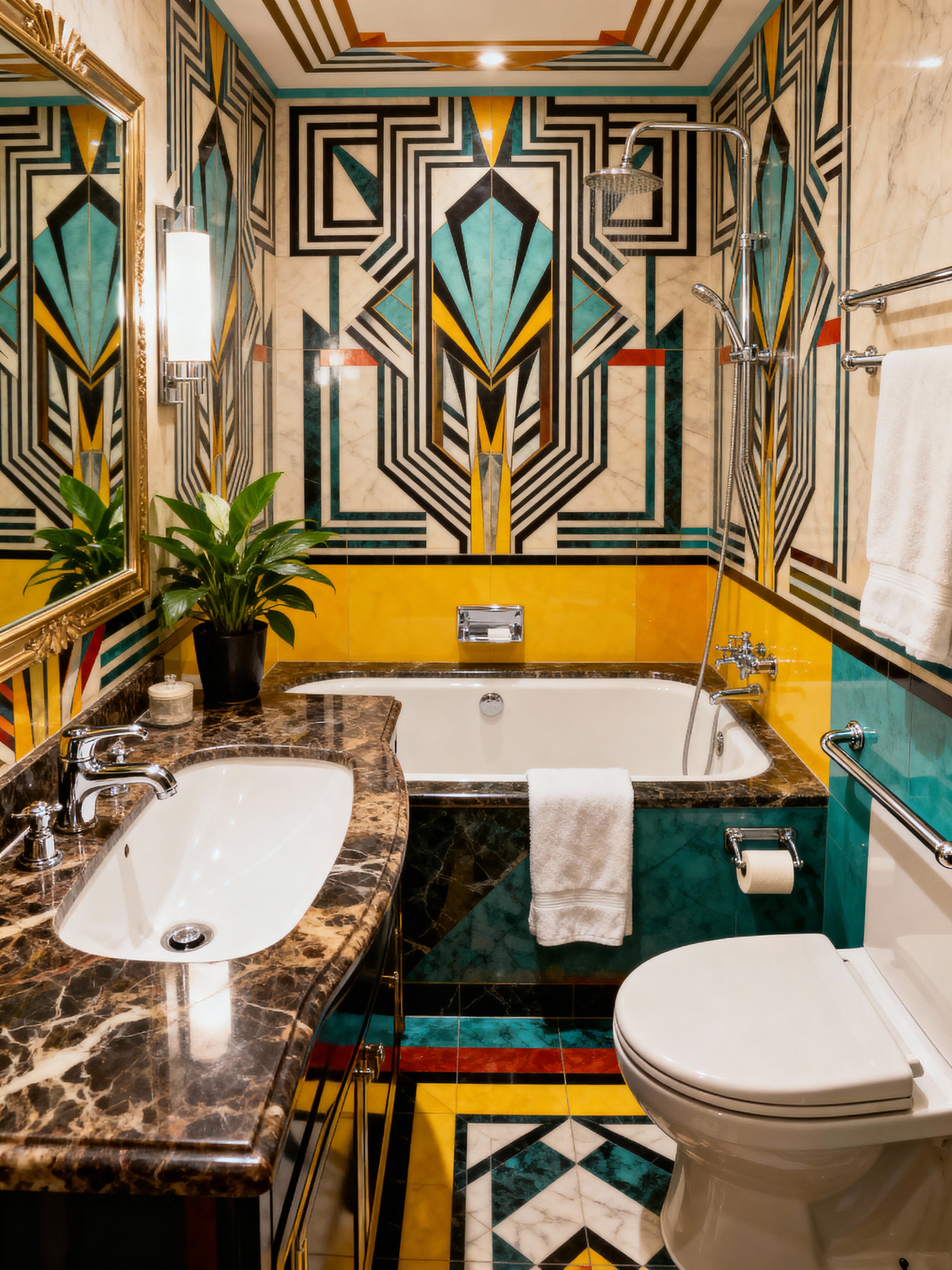 hotel bathroom with art deco style with bathroom sink with faucet and bathtub and mirror and shower and plant and bath towel and toilet seat and bath rail. . with geometric shapes and symmetrical designs and angular shapes and rich colors and luxury and stream-lined forms and bright and cheerful colors and smooth lines
