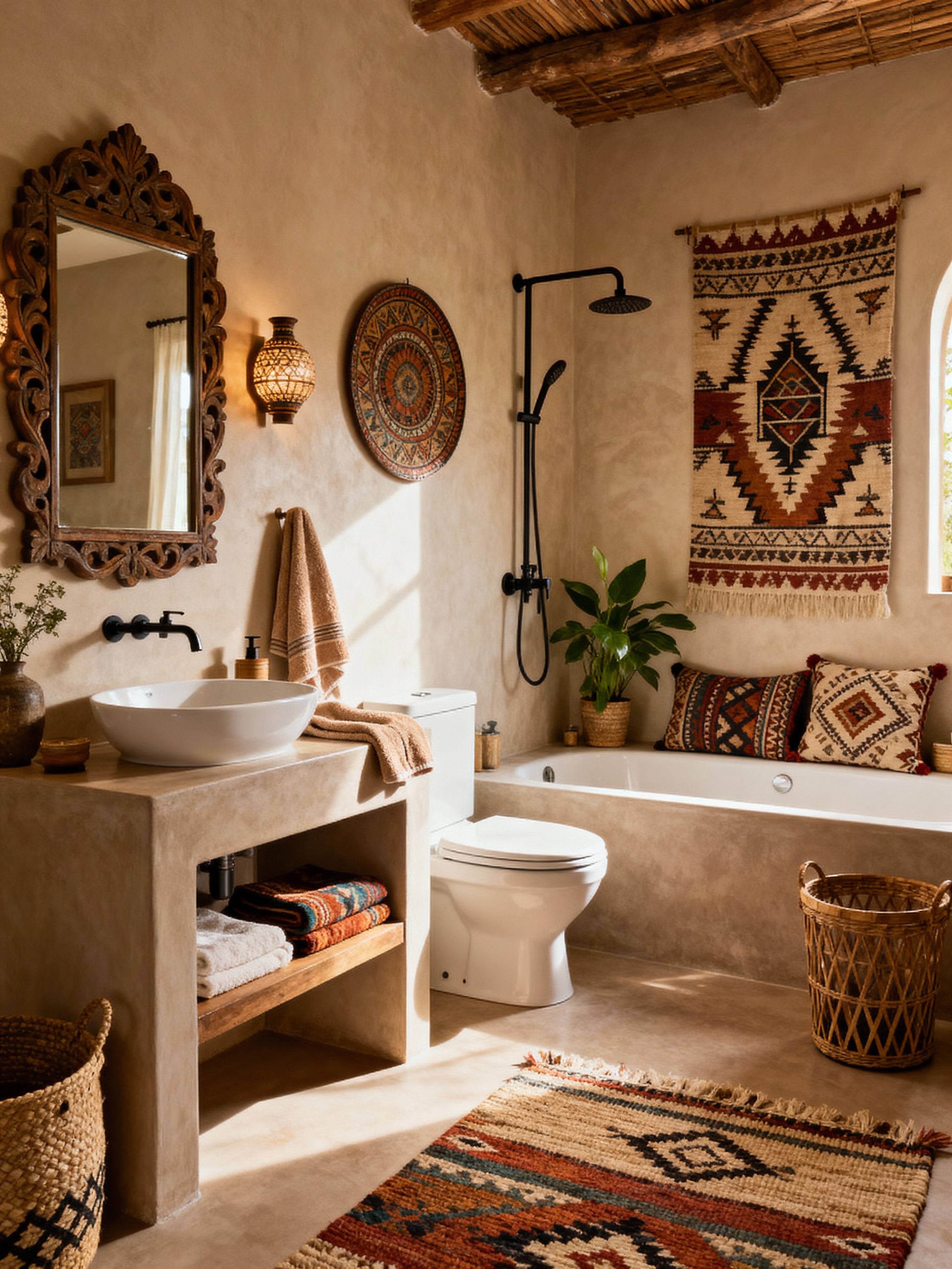 hotel bathroom with boho-chic style with bathroom sink with faucet and bath towel and mirror and toilet seat and shower and plant and bathtub and waste basket. . with mixed patterns and natural materials and free-spirited and layered textiles and bohemian flair and eclectic mix and global artifacts and artistic touches