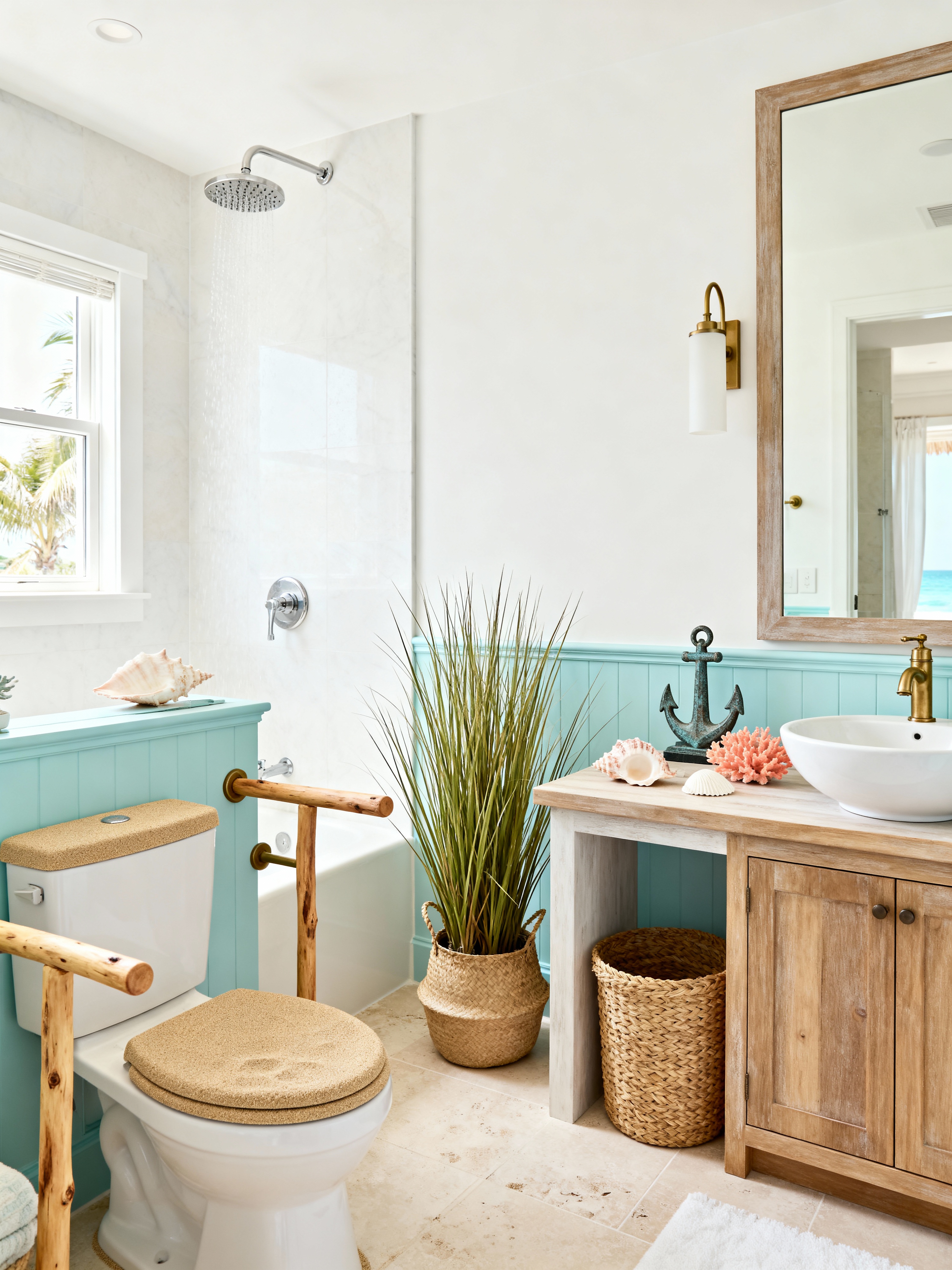 hotel bathroom with coastal style with toilet seat and bath rail and plant and waste basket and shower and bathroom sink with faucet and bathroom cabinet and mirror. . with sand tones and white decor and seaside colors and natural materials and beach vibes and nautical decor and ocean-inspired and airy feel