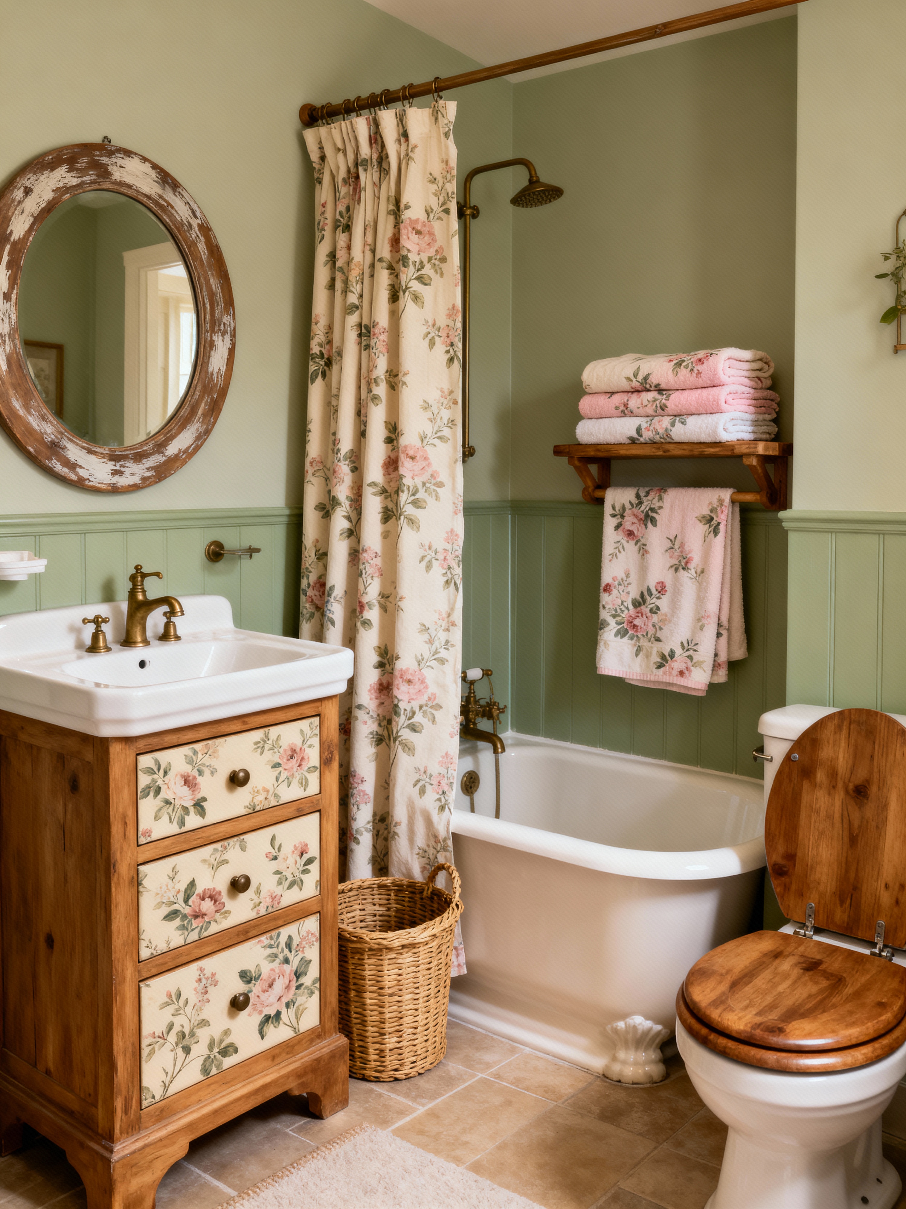 hotel bathroom with cottagecore style with bathroom cabinet and bathroom sink with faucet and waste basket and bath towel and bath rail and shower and toilet seat and mirror. . with earthy and floral patterns and cottage style and natural and organic and rustic and traditional and muted colors