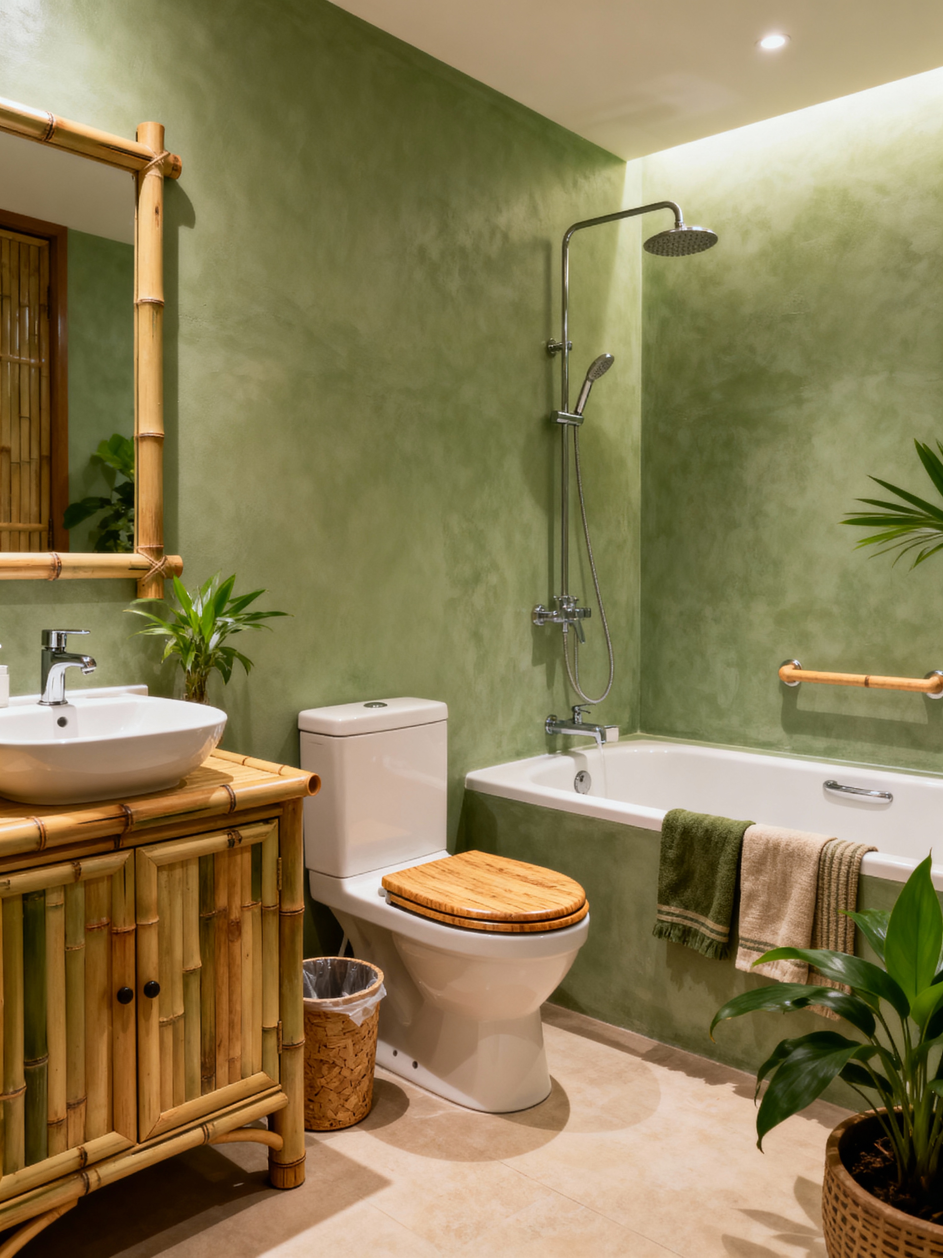 hotel bathroom with eco-friendly style with bathroom cabinet and toilet seat and bathroom sink with faucet and waste basket and bath rail and bathtub and shower and plant. . with energy efficient and environmentally conscious and non-toxic finishes and sustainable materials and renewable resources and organic textiles and bamboo furniture and green living