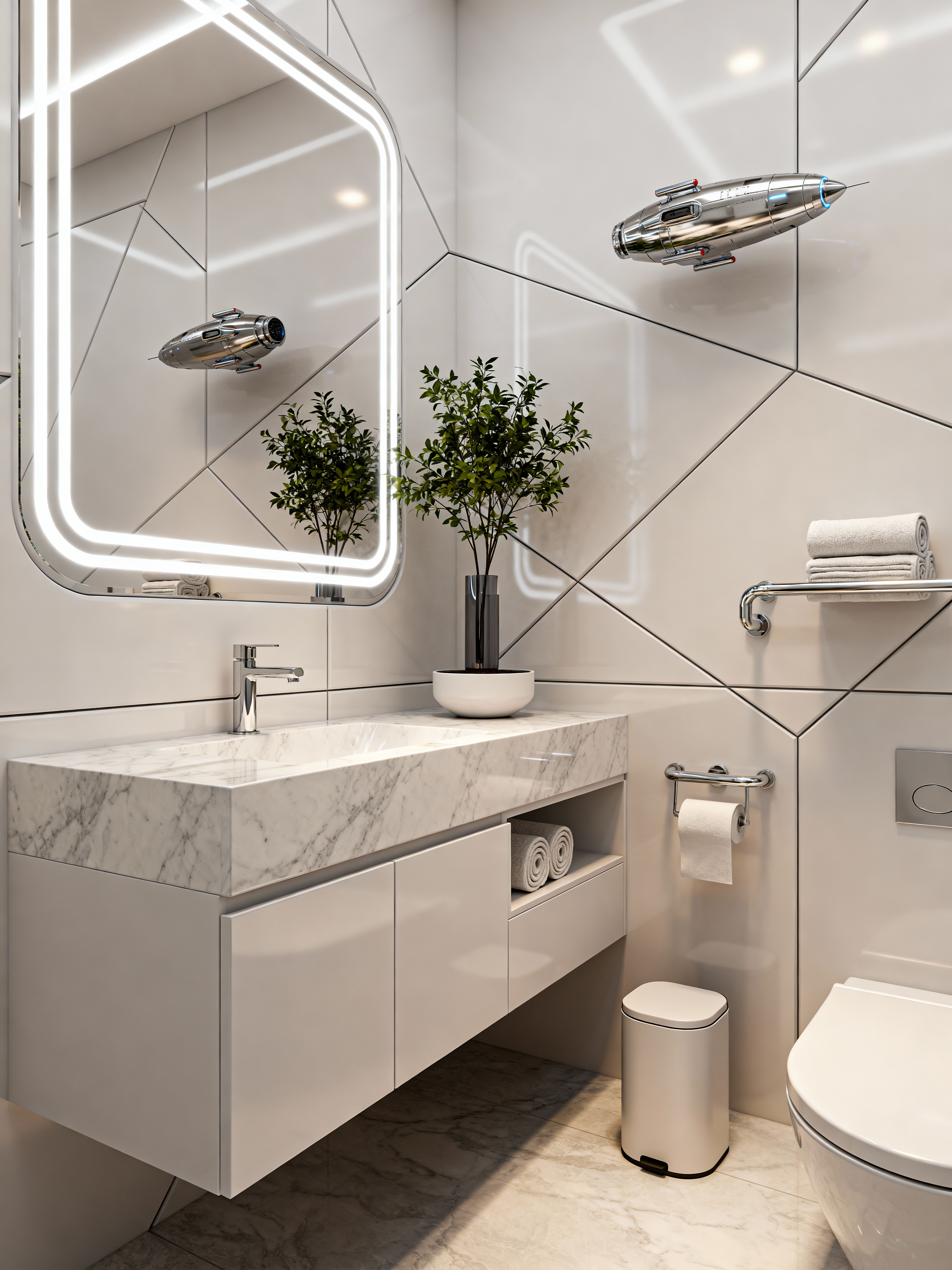 hotel bathroom with futuristic style with mirror and plant and bathroom cabinet and bathroom sink with faucet and bath rail and bath towel and waste basket and toilet seat. . with spaceship interior and minimalist clean lines and smooth polished marble and floating surfaces and strong geometric walls and smooth marble and futurism minimalist interior and light colors