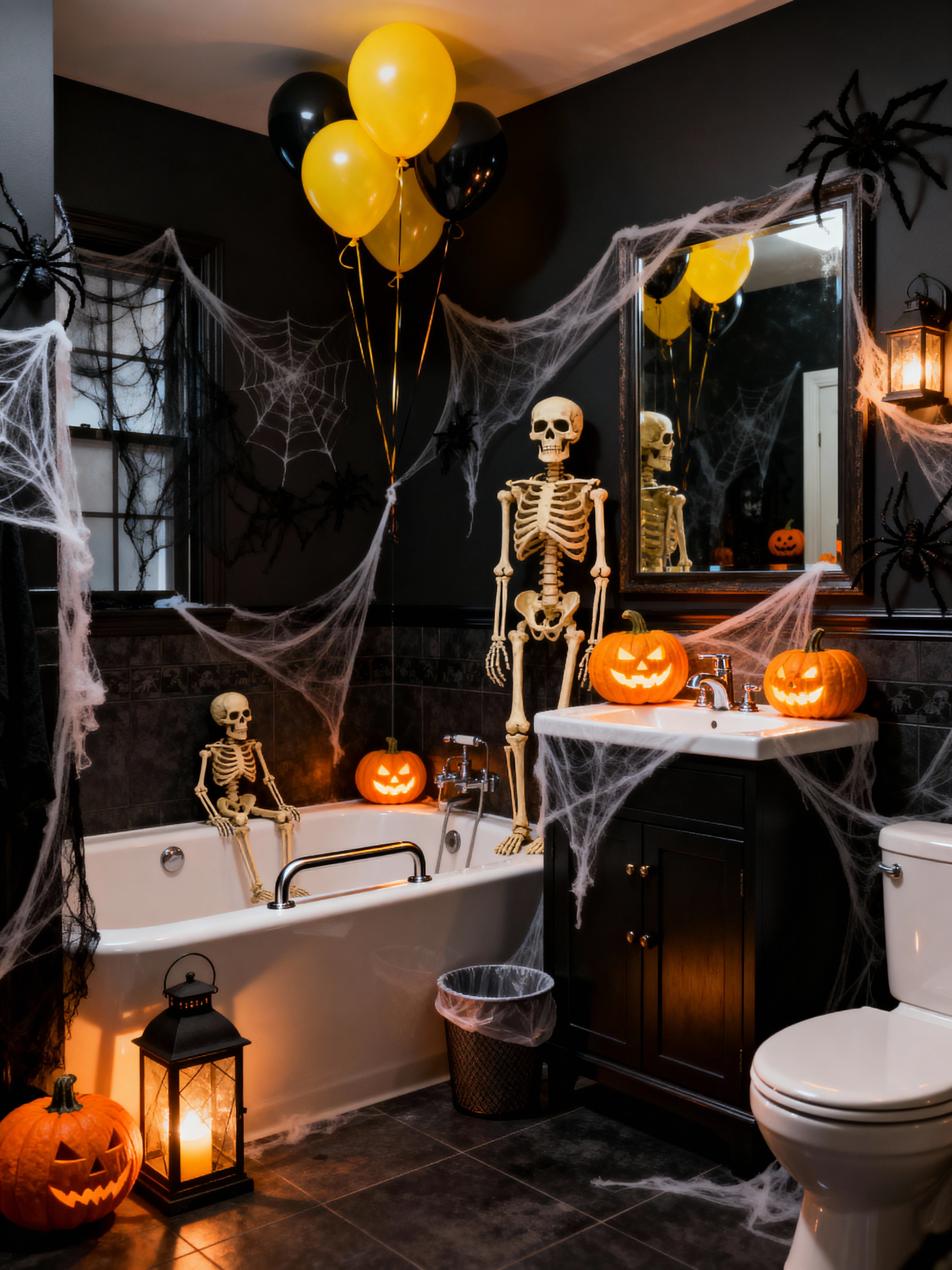 hotel bathroom with halloween style with bathtub and bathroom sink with faucet and plant and waste basket and bath rail and toilet seat and bathroom cabinet and mirror. . with cobwebs and lanterns and spiderwebs and yellow black balloons and human skulls and glowing pumpkins and cobwebs and skeletons sitting and standing