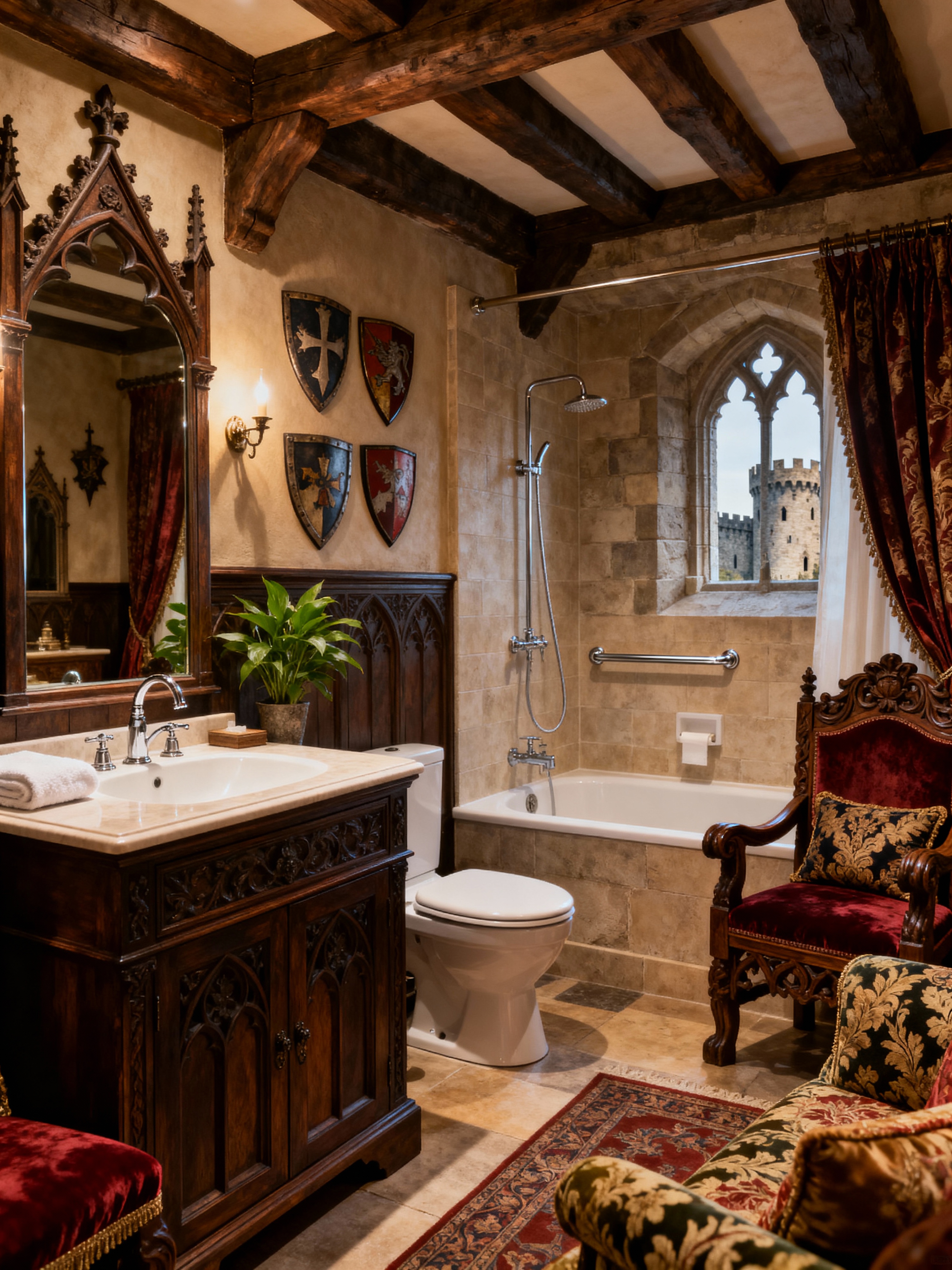 hotel bathroom with medieval style with bathroom sink with faucet and bathroom cabinet and bath towel and plant and shower and bath rail and mirror and toilet seat. . with timber beams and heavy furniture pieces and gothic appearance and medieval shields on the wall and carved wooden chairs and castle interior and velvet, chenille, damask, and brocade draperies and fabrics and upholstery on chairs and sofas