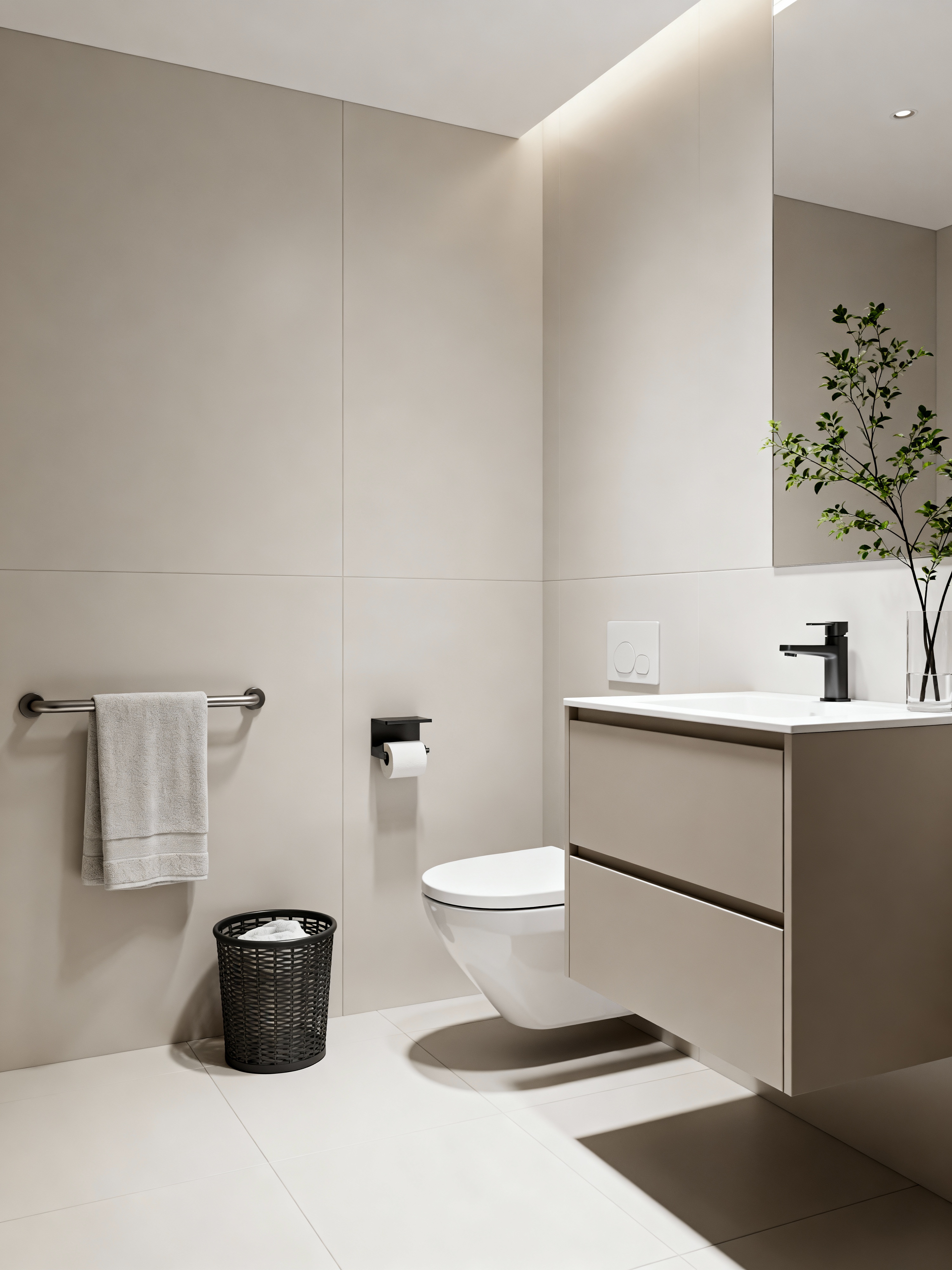 hotel bathroom with minimalist style with bath towel and waste basket and bathroom cabinet and bath rail and bathroom sink with faucet and plant and toilet seat and mirror. . with clean lines and an open floor plan and functional furniture and lots of light and a monochromatic palette with colour used as an accent and focus on the shape, colour and texture of just a few of essential elements and clean lines