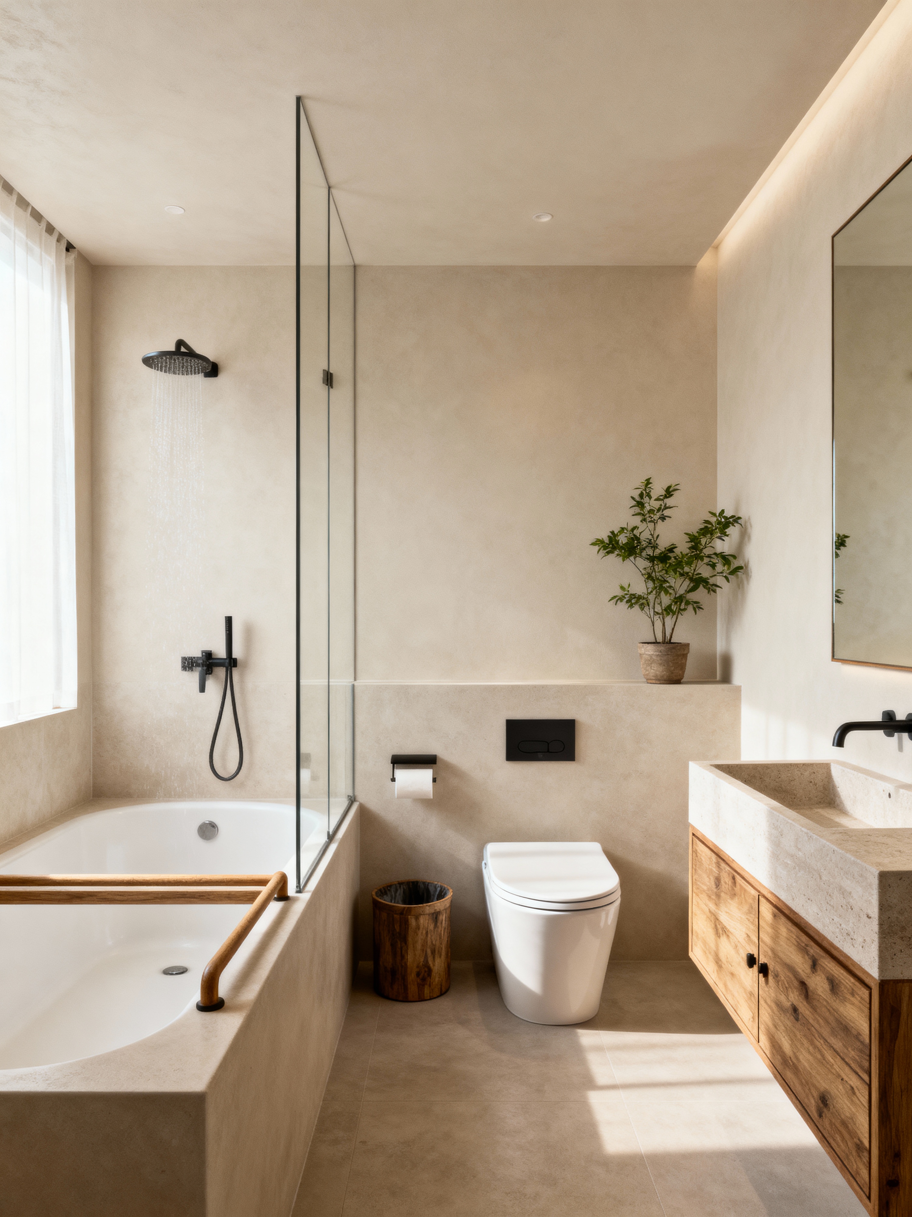 hotel bathroom with modern style with bath rail and toilet seat and shower and plant and mirror and waste basket and bathtub and bathroom cabinet. . with simple, clean lines and simplistic furniture and neutral walls and textures and open and natural lighting and natural materials and elements and practicality and functionality and simple, clean lines and simplistic furniture