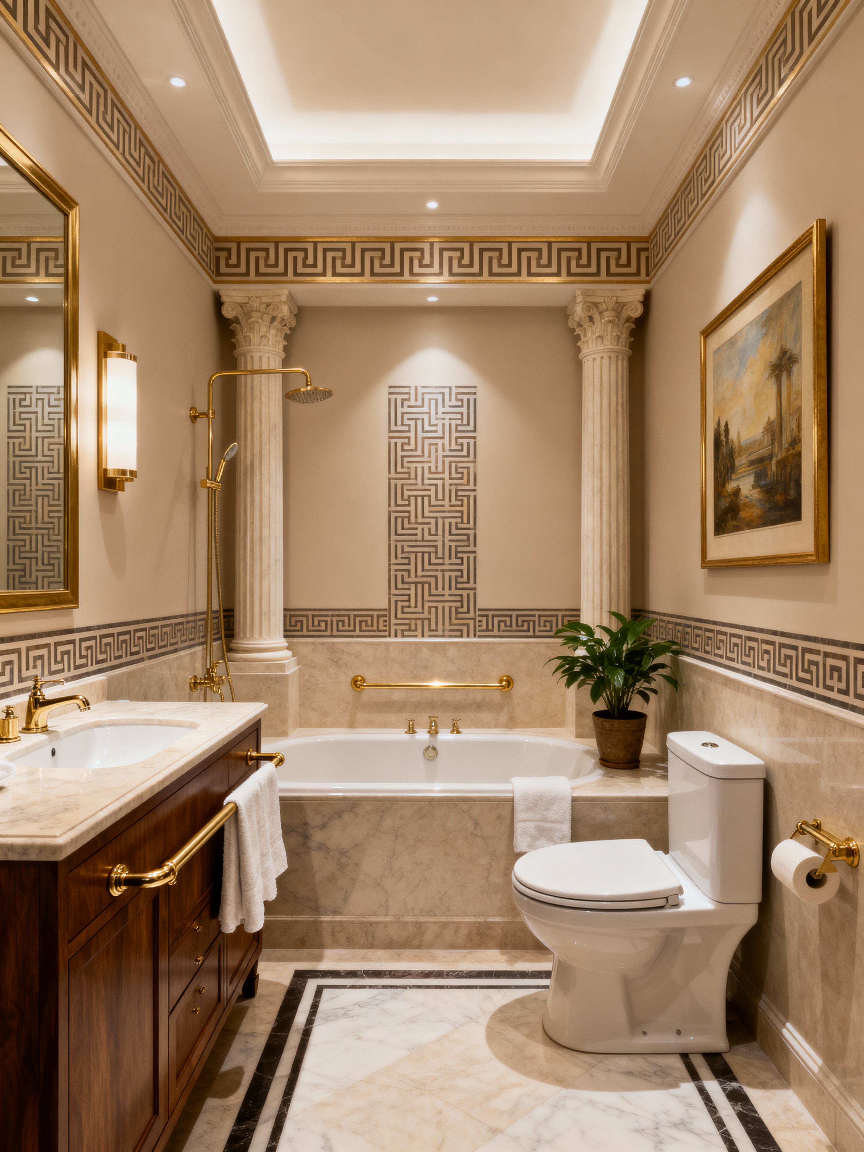 hotel bathroom with neoclassic style with shower and mirror and toilet seat and bath rail and bathtub and bath towel and bathroom sink with faucet and plant. . with timeless furniture and spacious rooms and greek columns and geometric decorative elements and timeless artwork and emphasized horizontal and vertical lines and symmetric layouts and thoughtful minimalism