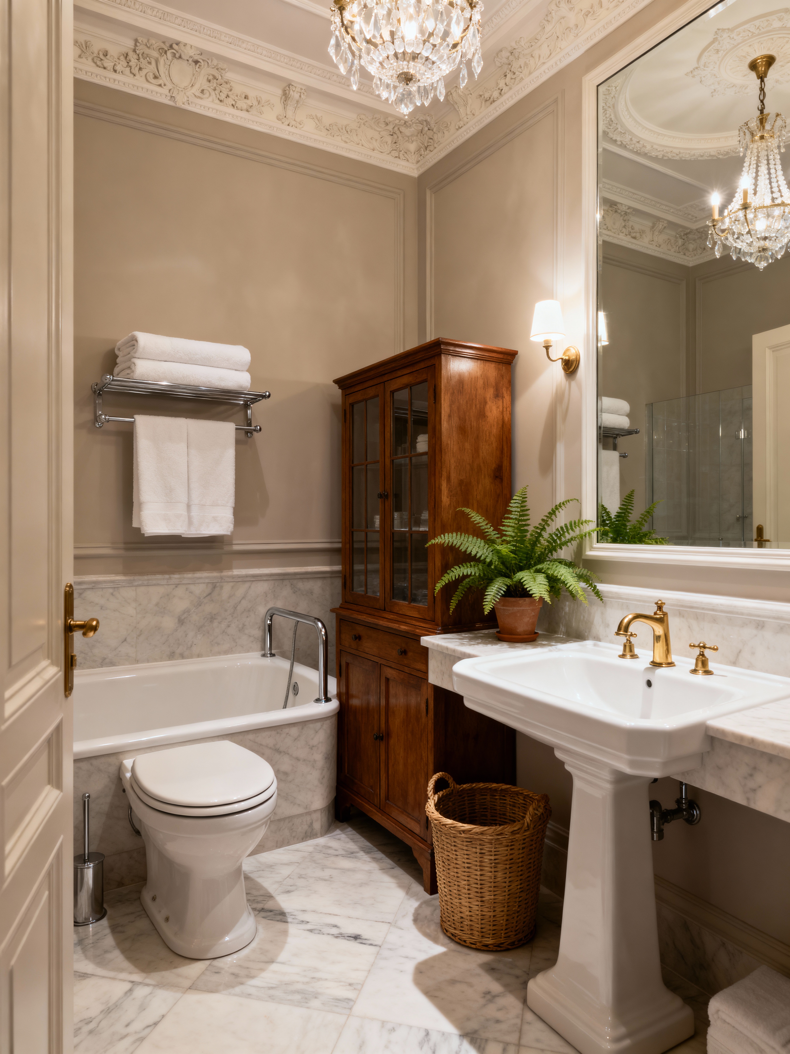 hotel bathroom with parisian style with waste basket and bathroom sink with faucet and toilet seat and bath rail and plant and bathroom cabinet and bathtub and bath towel. . with chic simplicity and refined style and french elegance and sophisticated charm and neutral palette and european flair and ornate moldings and classic details