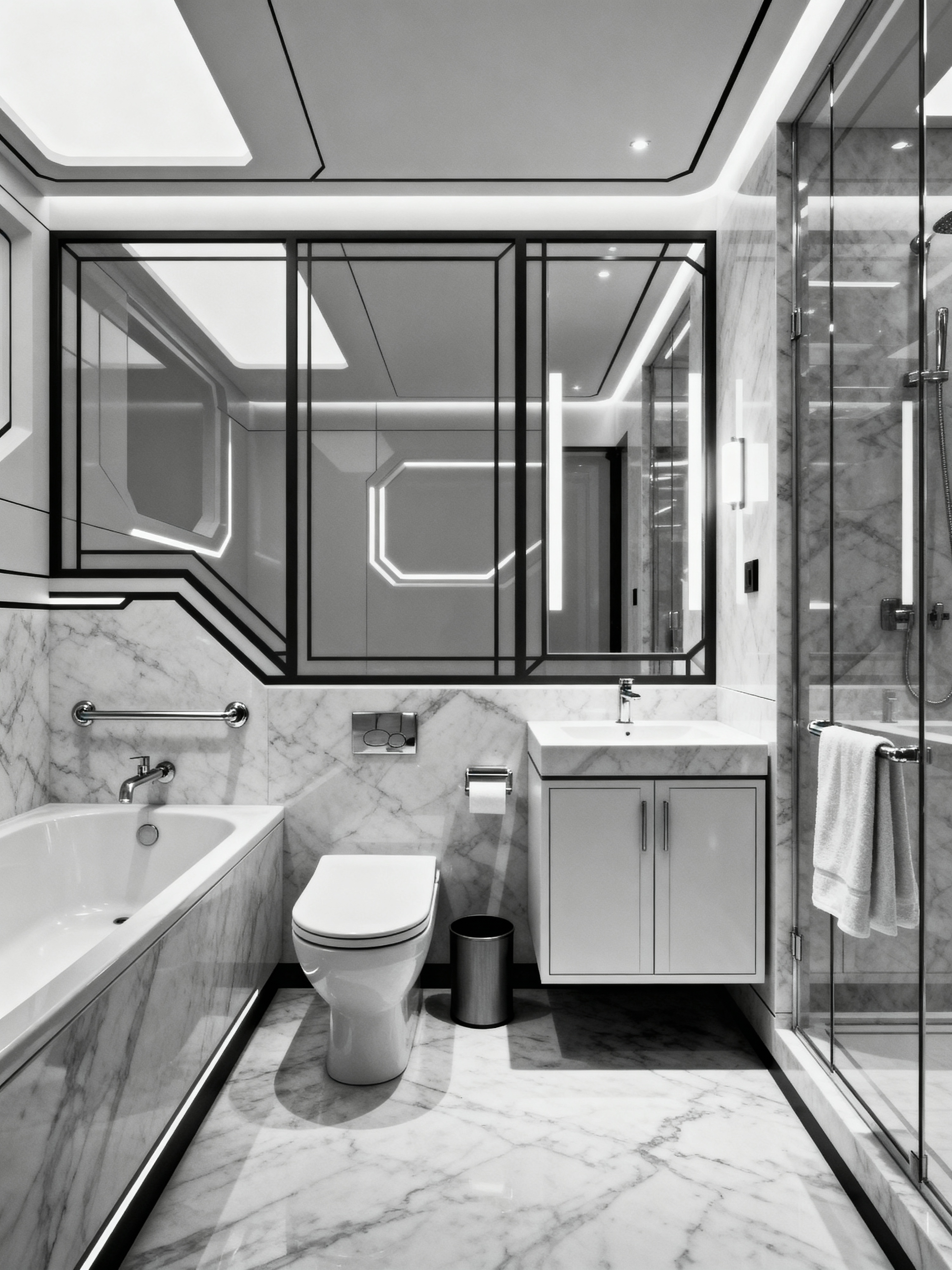 hotel bathroom with retro futuristic style with bath rail and bathtub and mirror and toilet seat and waste basket and bathroom cabinet and shower and bath towel. . with monochromatic palette and floating surfaces and vintage futurism and strong geometric walls and glass panes and smooth marble and minimalist clean lines and futurism minimalist interior