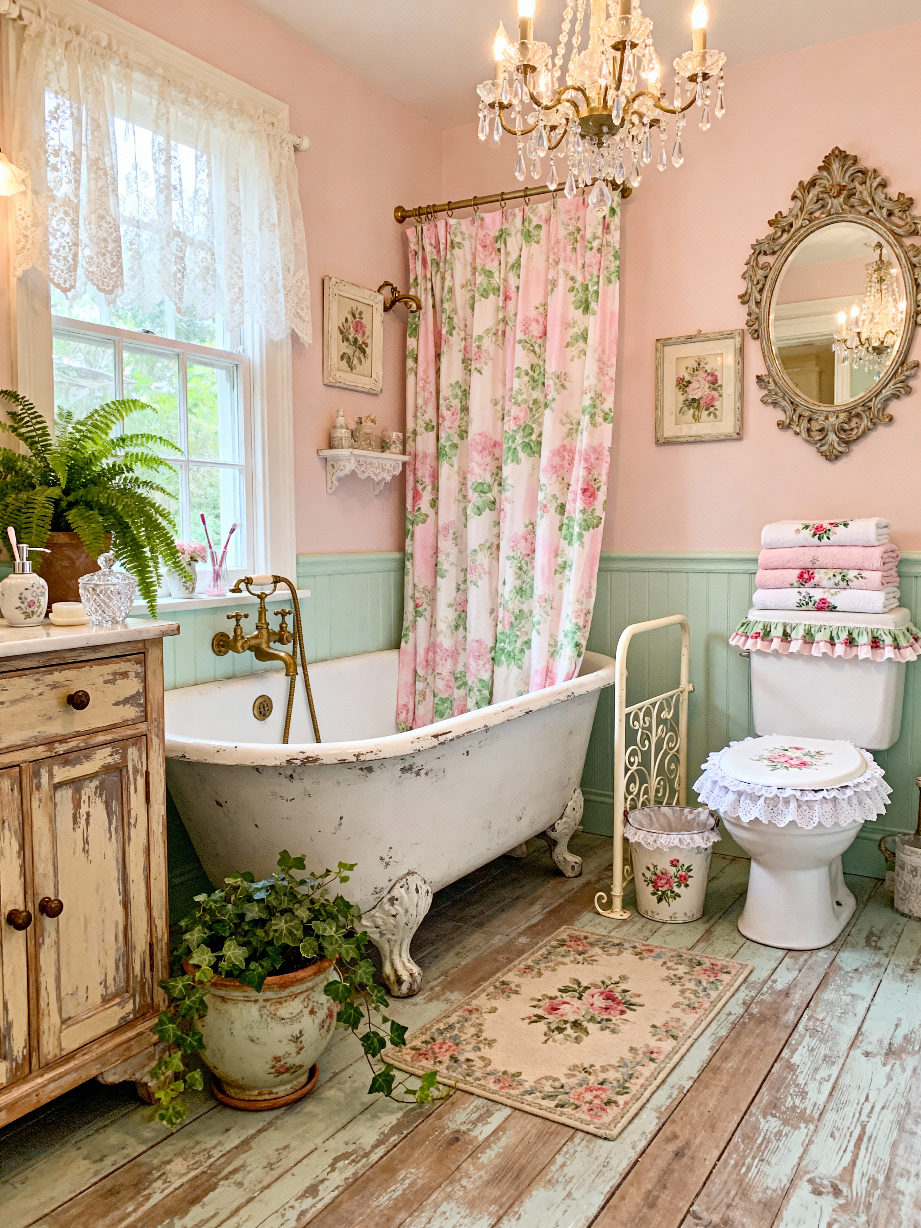hotel bathroom with shabby chic style with plant and waste basket and bathtub and bath rail and bath towel and toilet seat and bathroom cabinet and shower. . with romantic style and floral patterns and cottage feel and vintage charm and weathered finishes and feminine touches and delicate details and antique lace