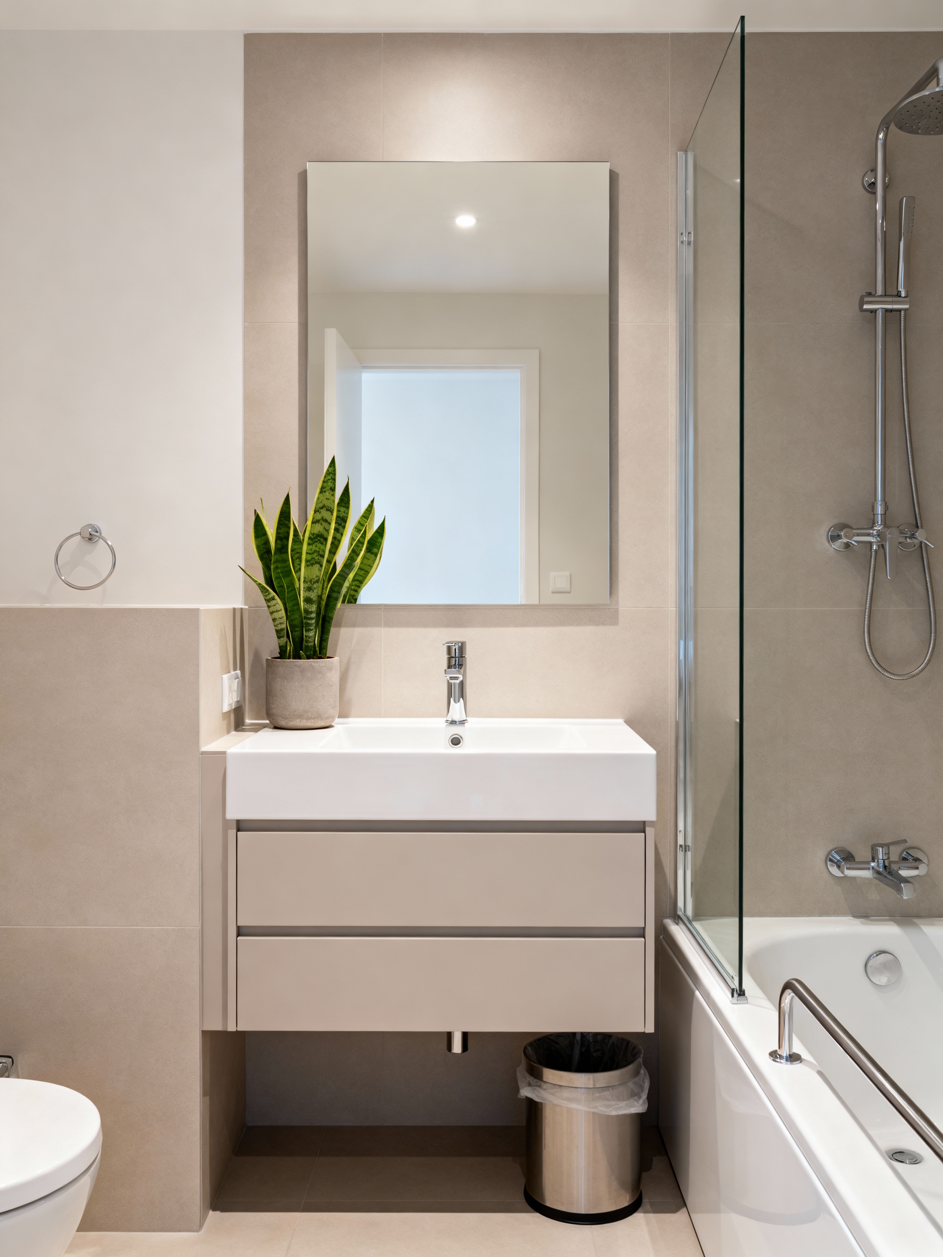 hotel bathroom with simple style with mirror and plant and waste basket and bathroom cabinet and shower and bathroom sink with faucet and bathtub and bath rail. . with minimal decor and essential pieces and understated style and clean design and uncluttered space and streamlined look and neutral colors and functional furniture