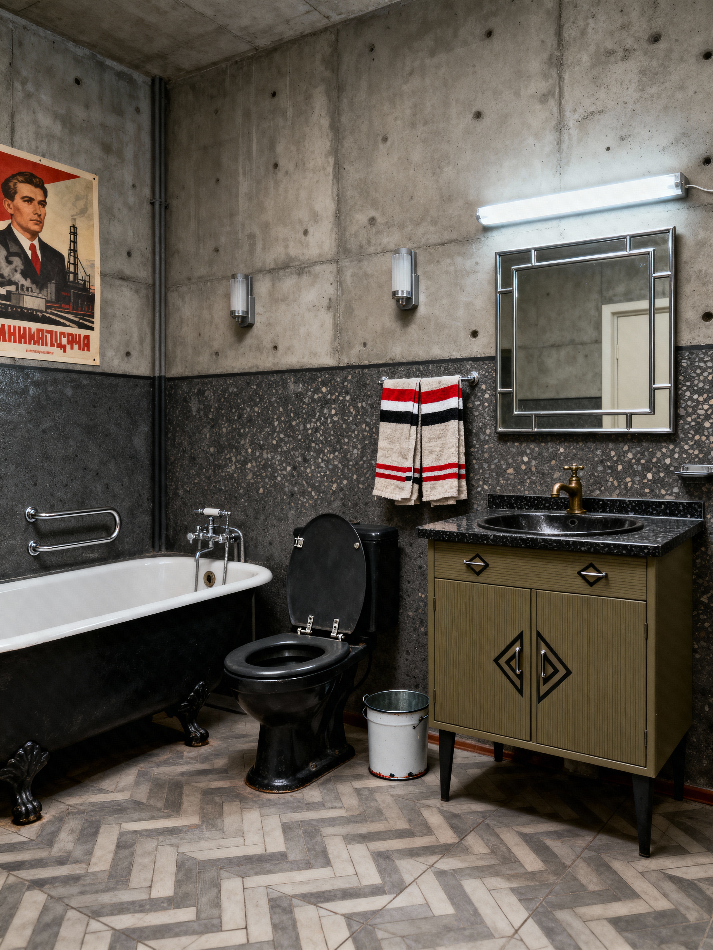 hotel bathroom with soviet style with bathtub and toilet seat and bath rail and waste basket and bath towel and mirror and bathroom sink with faucet and bathroom cabinet. . with institutional look and brutalist style and communist design and soviet-era architecture and functional furniture and concrete structures and eastern bloc and socialist realism