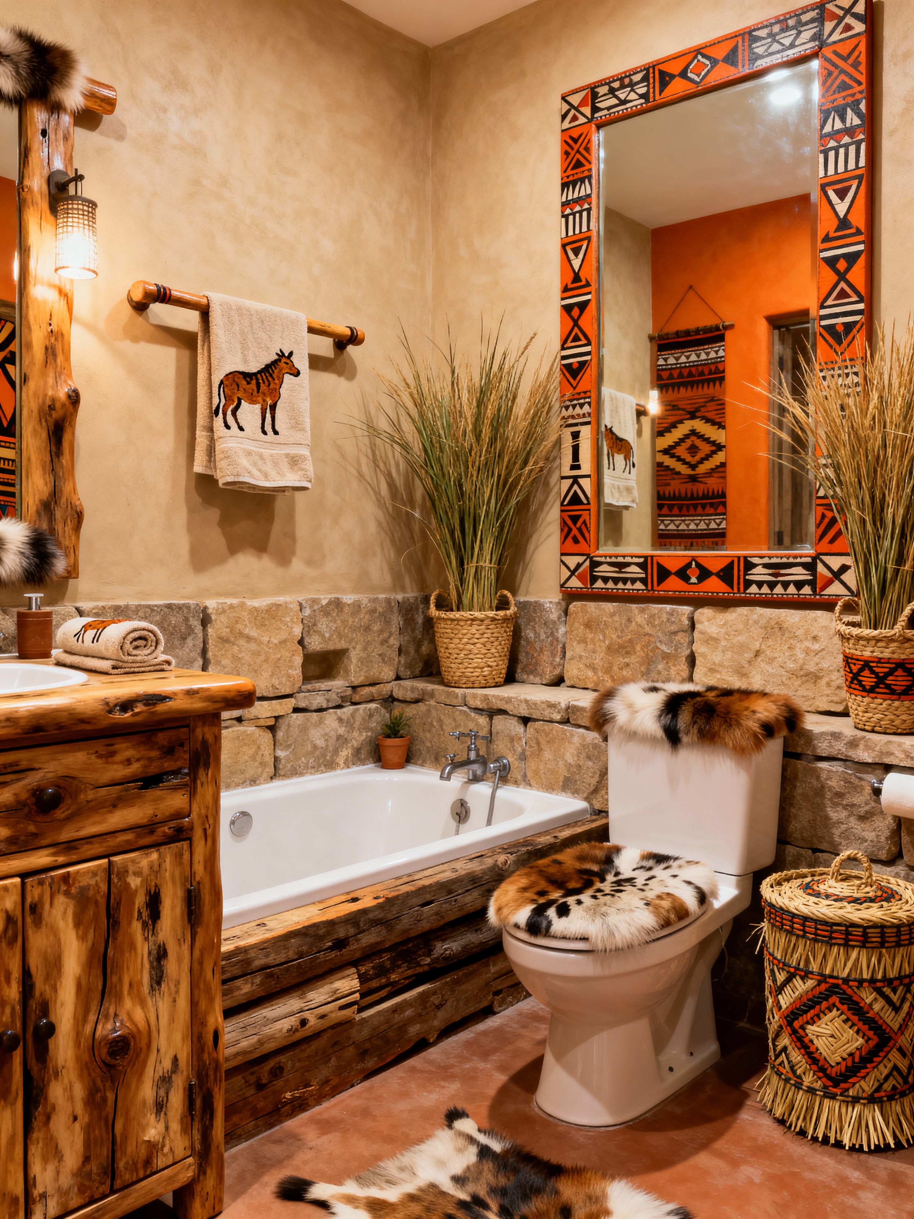 hotel bathroom with tribal style with bath rail and bath towel and toilet seat and bathroom cabinet and bathtub and plant and mirror and waste basket. . with desert colours and animal furslinen and intricate grass weaving and animal prints and planks of stone and tribal patterns and smooth worn timbers and exuberant splashes of colour
