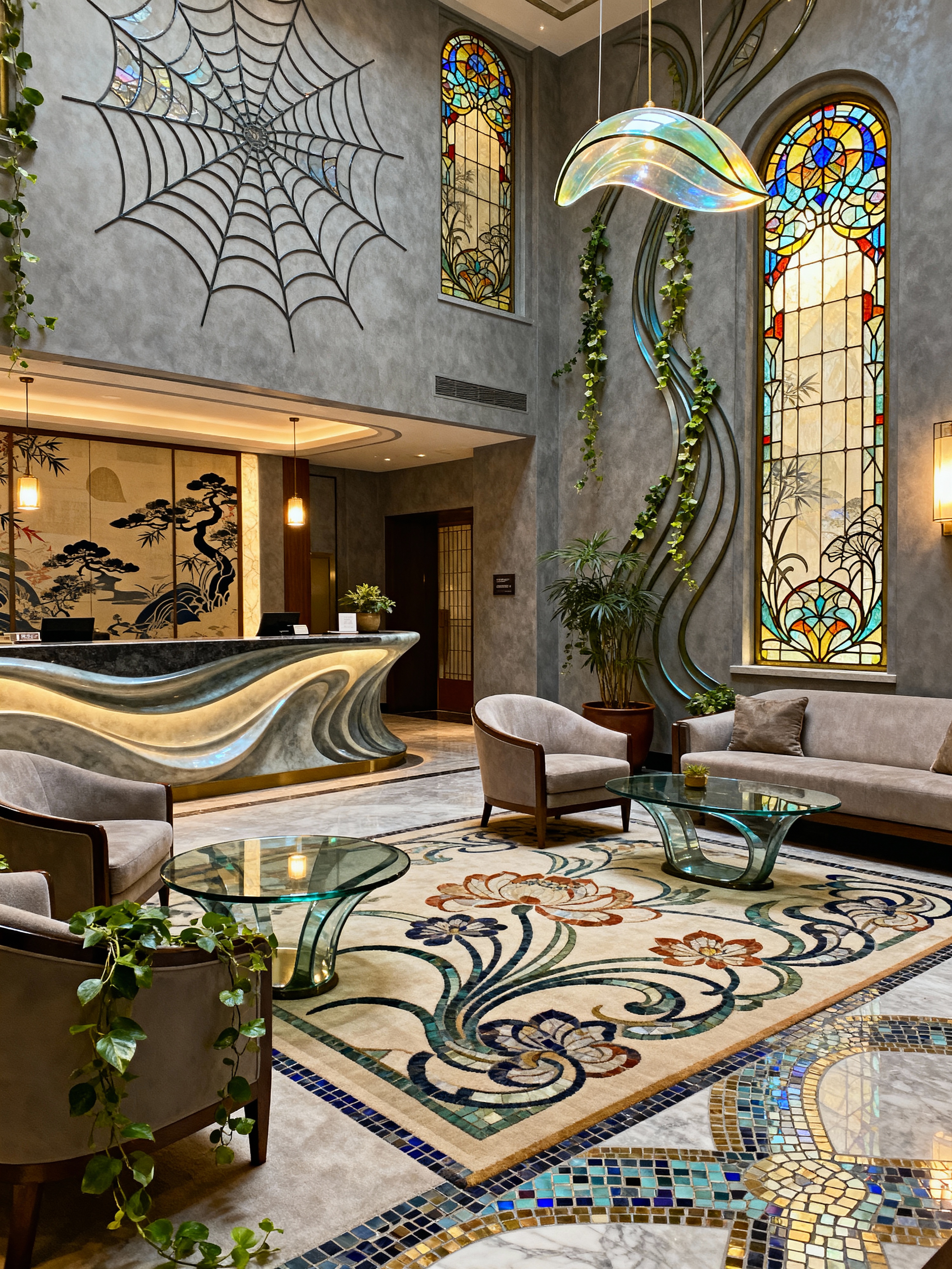 hotel lobby with art nouveau style with lounge chairs and rug and sofas and furniture and hanging lamps and plant and coffee tables and check in desk. . with stained glass and ashy colors and wallpaper pattners of spider webs and mosaics and asymmetrical shapes and curving, plant-like embellishments and japanese motifs and curved glass
