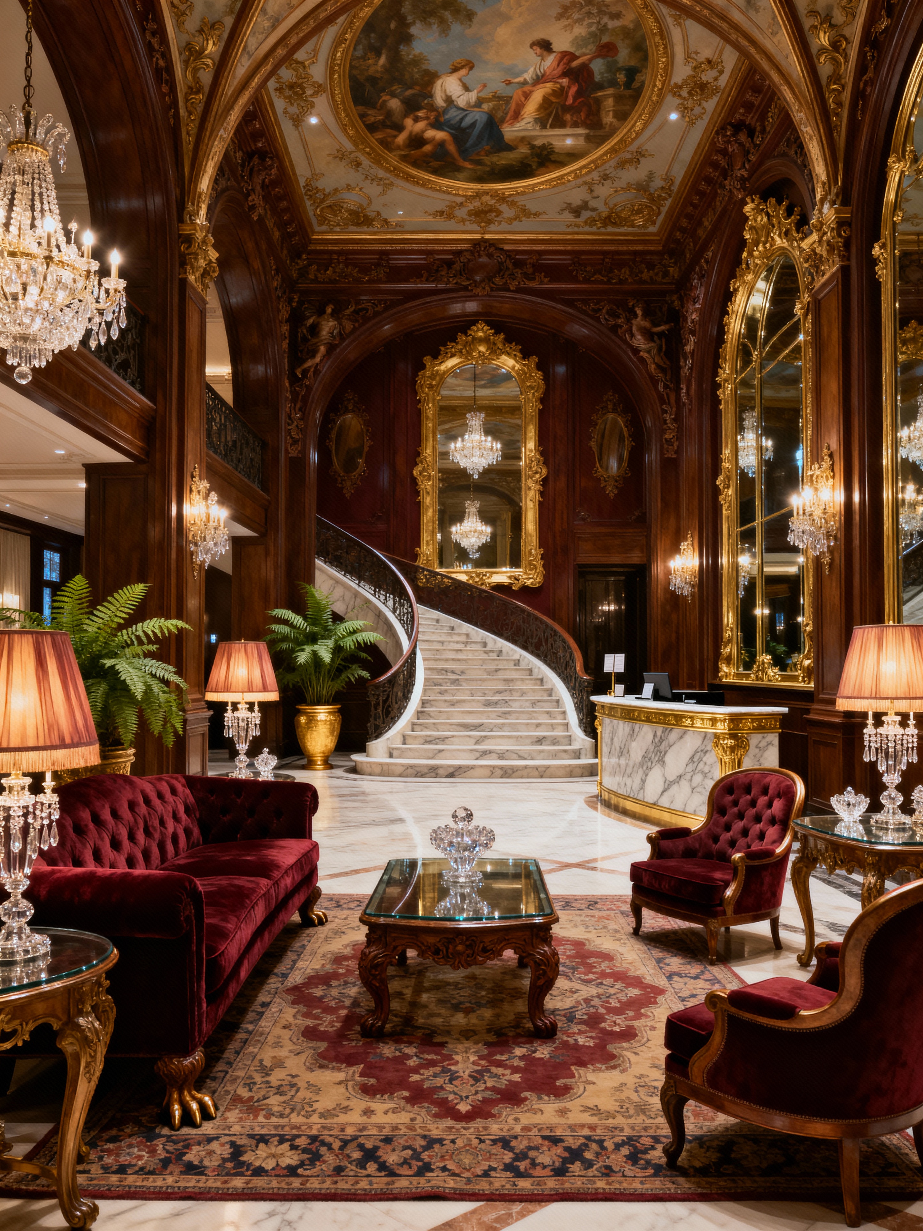 hotel lobby with baroque style with coffee tables and hanging lamps and lounge chairs and plant and furniture and sofas and check in desk and rug. . with heavy moldings and tension and movement and drama and pedestal feet and emotional exuberance and crystal and glass accents and dynamism