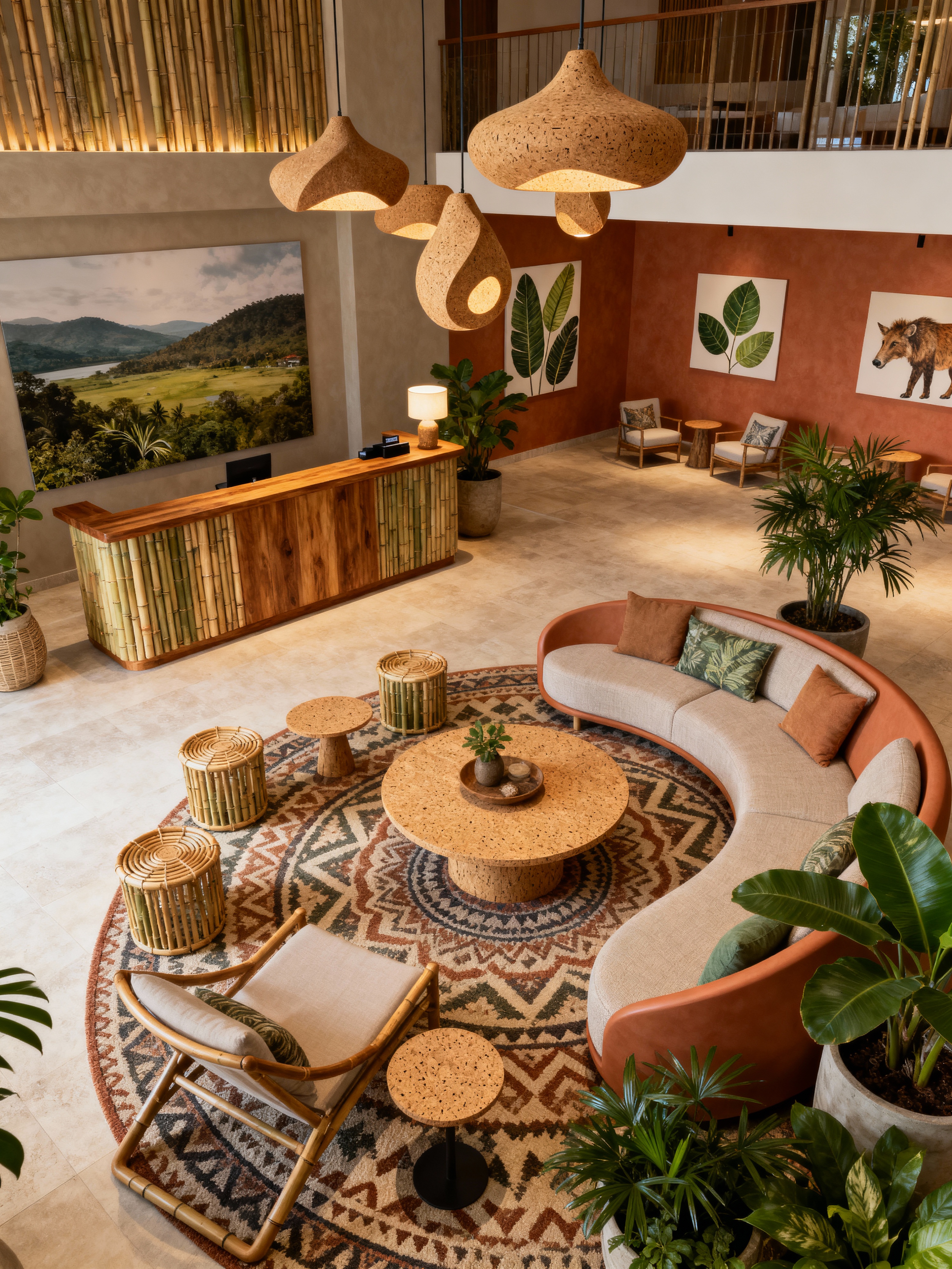 hotel lobby with biophilic style with rug and check in desk and coffee tables and hanging lamps and furniture and sofas and plant and lounge chairs. . with wood materials and images of nature and bamboo materials and natural shapes and forms and earthy colors and images of animals and calming style and cork materials